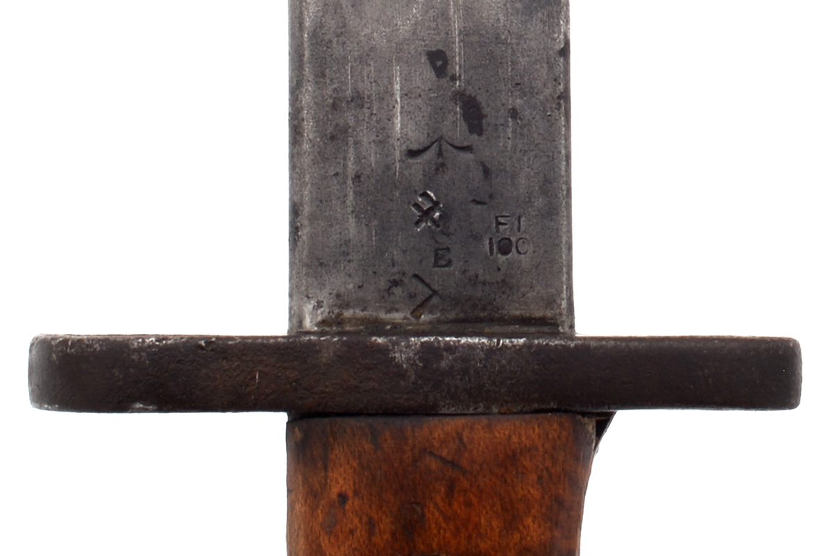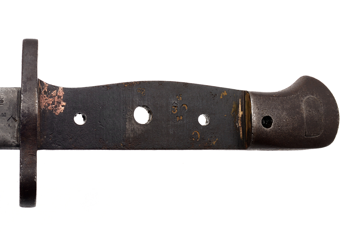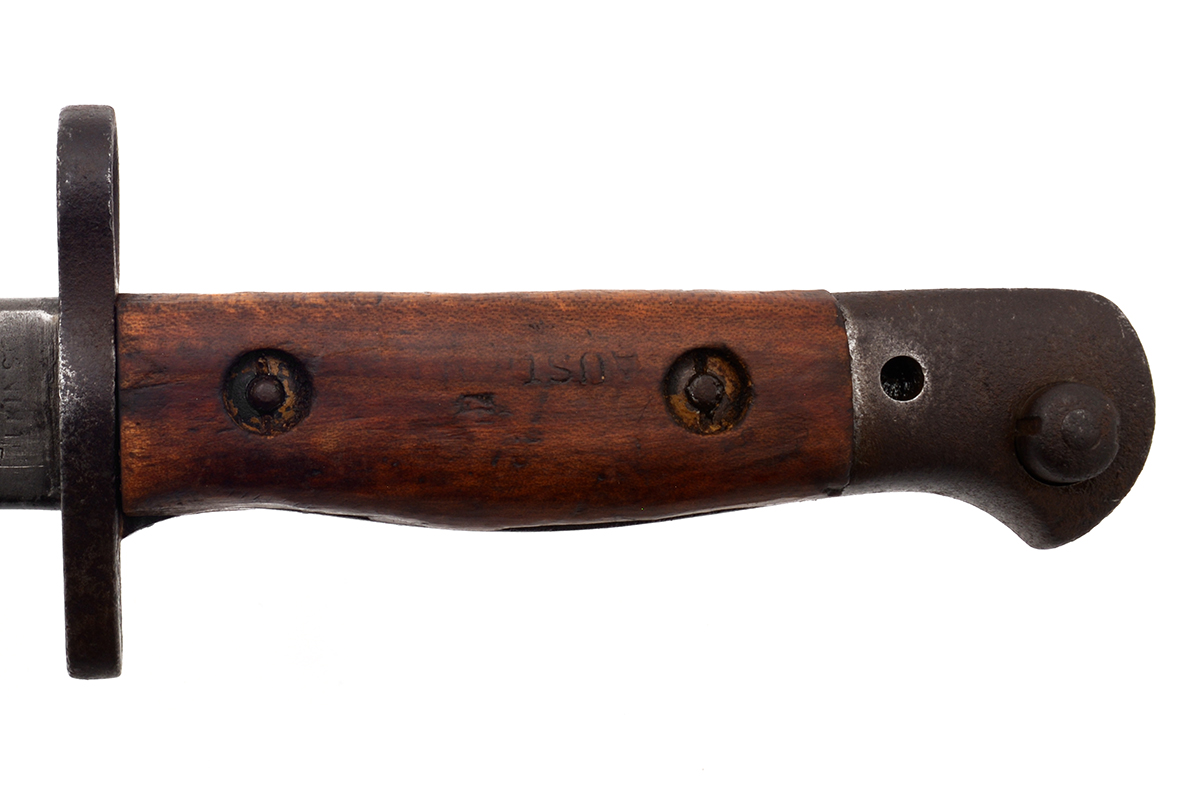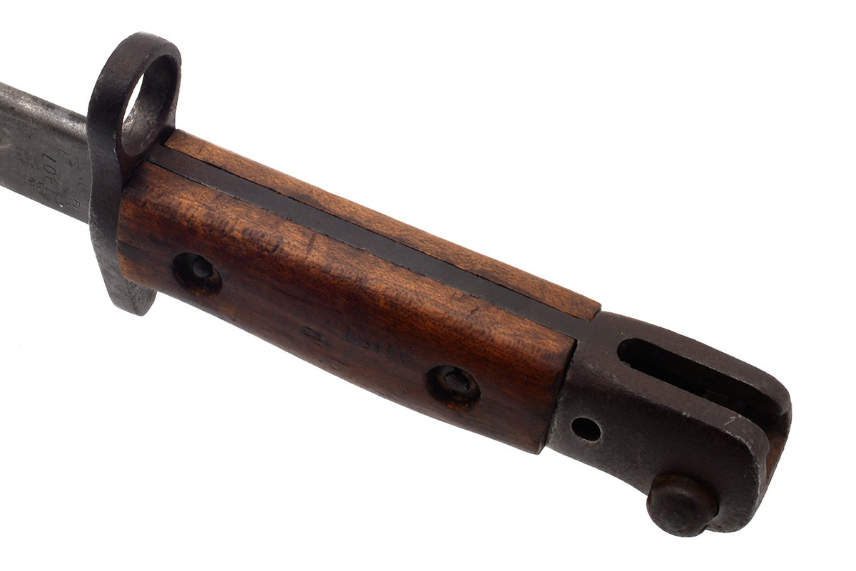 This is an Australian Pattern 1907 Bayonet for the Short Magazine Lee–Enfield No.1 Mk.III (SMLE) rifle. It features a 17" blade and total length of 21.75", the ricasso is marked "1907" over a faintly marked "WILKINSON" along with various proof marks. The wood grips are numbered on the inside and left side panel is marked "AUSTRALIA" on the outside, with the grips removed the tang shows various proof marks. The scabbard is marked "MANGROVITE '43" indicating it was manufactured by Mangrovite Belting and the fittings are marked "OA" for Orange Arsenal. Overall condition of the bayonet is good with a slightly sharpened edge, there is a fair bit of wear, patina and some light pitting especially on the pommel. The scabbard is in nice shape with some patina to the fittings, the leather has some scuffs and scratches but strong stitching. Buy online today!