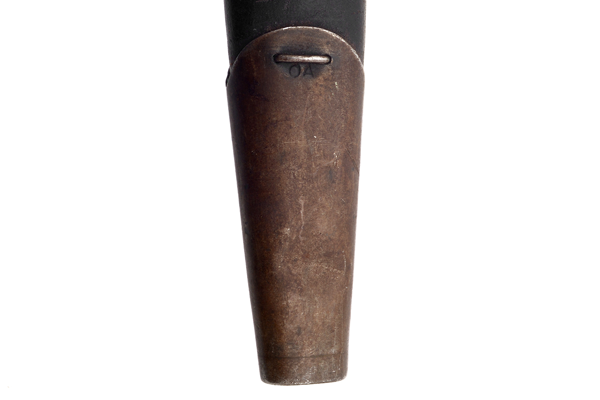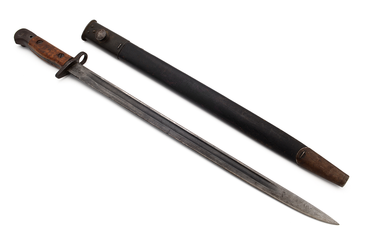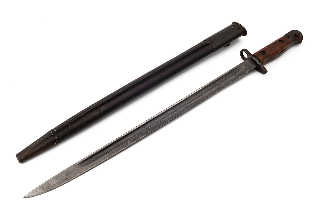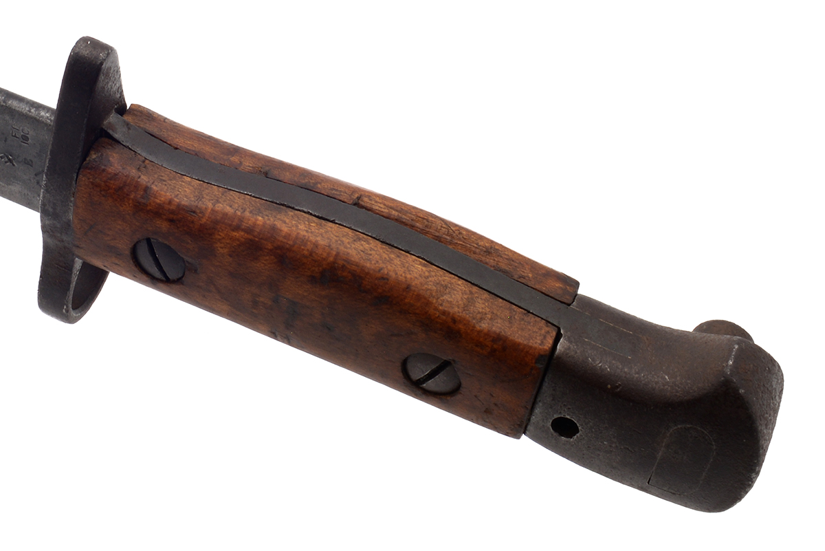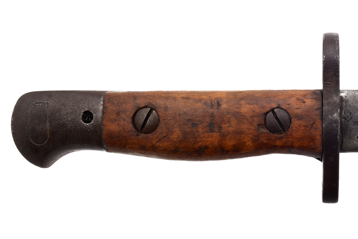 This is an Australian Pattern 1907 Bayonet for the Short Magazine Lee–Enfield No.1 Mk.III (SMLE) rifle. It features a 17" blade and total length of 21.75", the ricasso is marked "1907" over a faintly marked "WILKINSON" along with various proof marks. The wood grips are numbered on the inside and left side panel is marked "AUSTRALIA" on the outside, with the grips removed the tang shows various proof marks. The scabbard is marked "MANGROVITE '43" indicating it was manufactured by Mangrovite Belting and the fittings are marked "OA" for Orange Arsenal. Overall condition of the bayonet is good with a slightly sharpened edge, there is a fair bit of wear, patina and some light pitting especially on the pommel. The scabbard is in nice shape with some patina to the fittings, the leather has some scuffs and scratches but strong stitching. Buy online today!