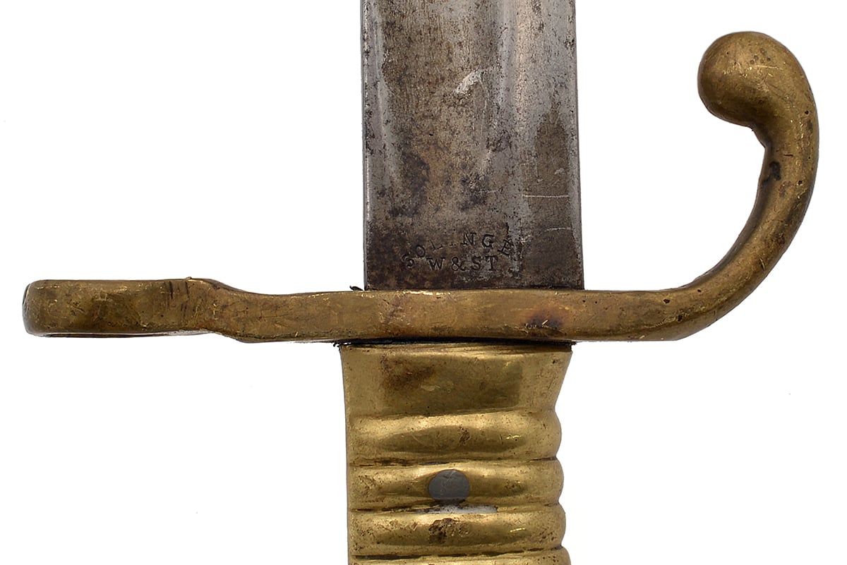 This is an Bavarian (German) M1869 Werder bayonet. It features an 18.25" "yataghan" style blade and overall length of 23", the ricasso is marked "SOLINGEN" in an arc over "W & ST" indicating Weyersberg & Stamm manufacture. Overall condition is fair with the original edge, there is quite a bit of tarnishing and corrosion to blade flats. There is no scabbard included with this bayonet. Buy online today!