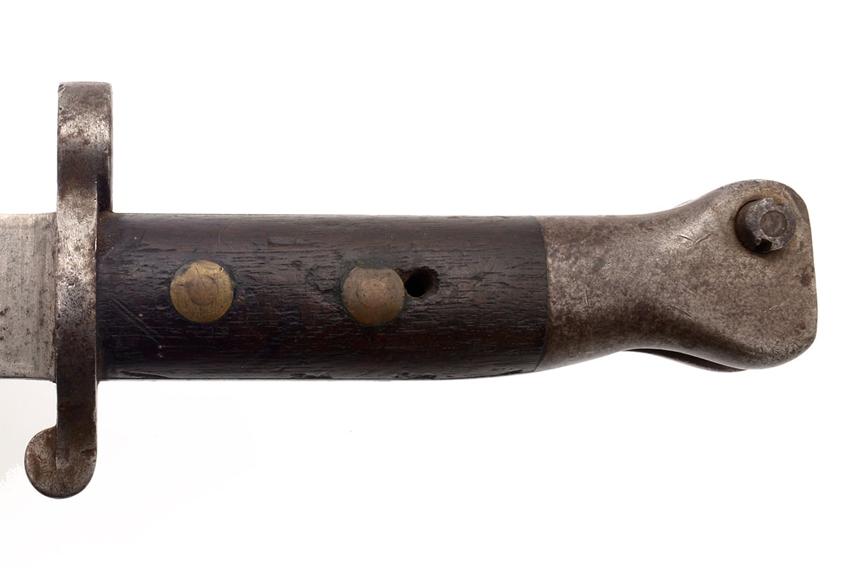 This is British Pattern 1888 Mk1 Type2 bayonet for the Lee-Metford or Lee-Enfield rifle. It features an 11.75-inch sharpened blade and overall length of 16.5 inches. It was manufactured by Wilkinson in November, 1899. Overall this bayonet is in fair condition. It has been very roughly sharpened along both edges and there are scuffs marks on both sides of the blade. The wood grips have some chips and dings and the metal has a fair amount of patina. There is no scabbard included. Buy online today!