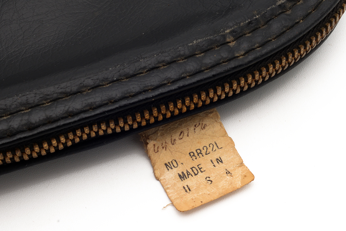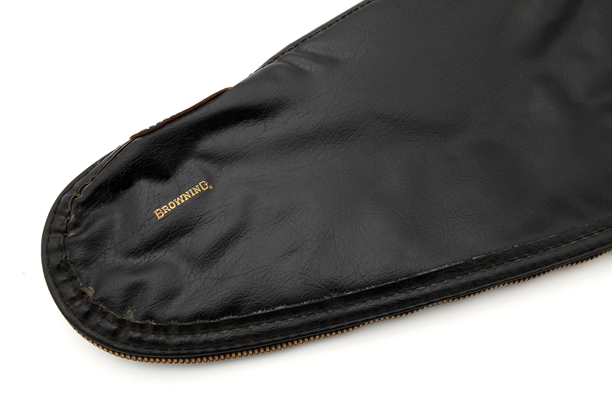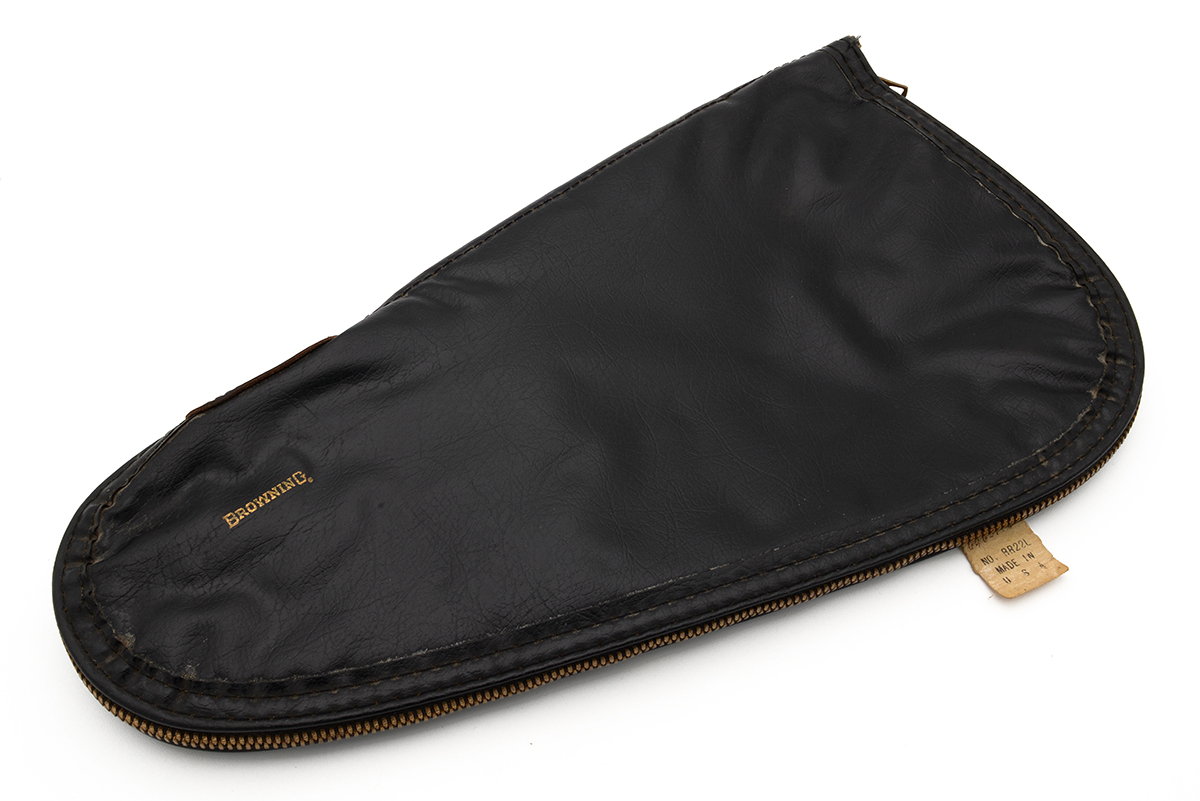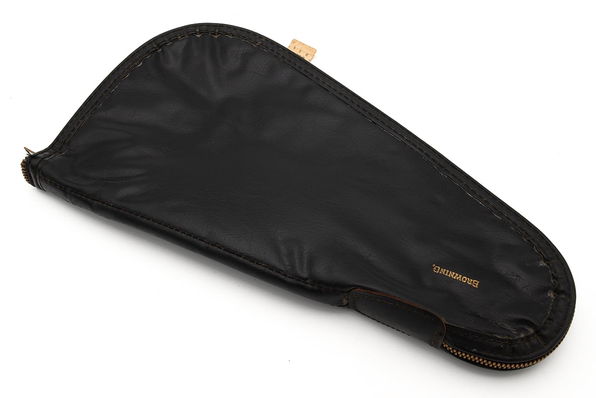 This is a vintage Browning marked pistol case. It features black vinyl construction with red felt lining and brass zipper. The case measures 14" from end to end and 7.5" across at it's widest, the tag is marked RR22L which suggests that it was probably meant for a Browning Challenger, Nomad or similar handgun. Overall condition is good, the vinyl is supple and the felt interior is clean. Buy online today!