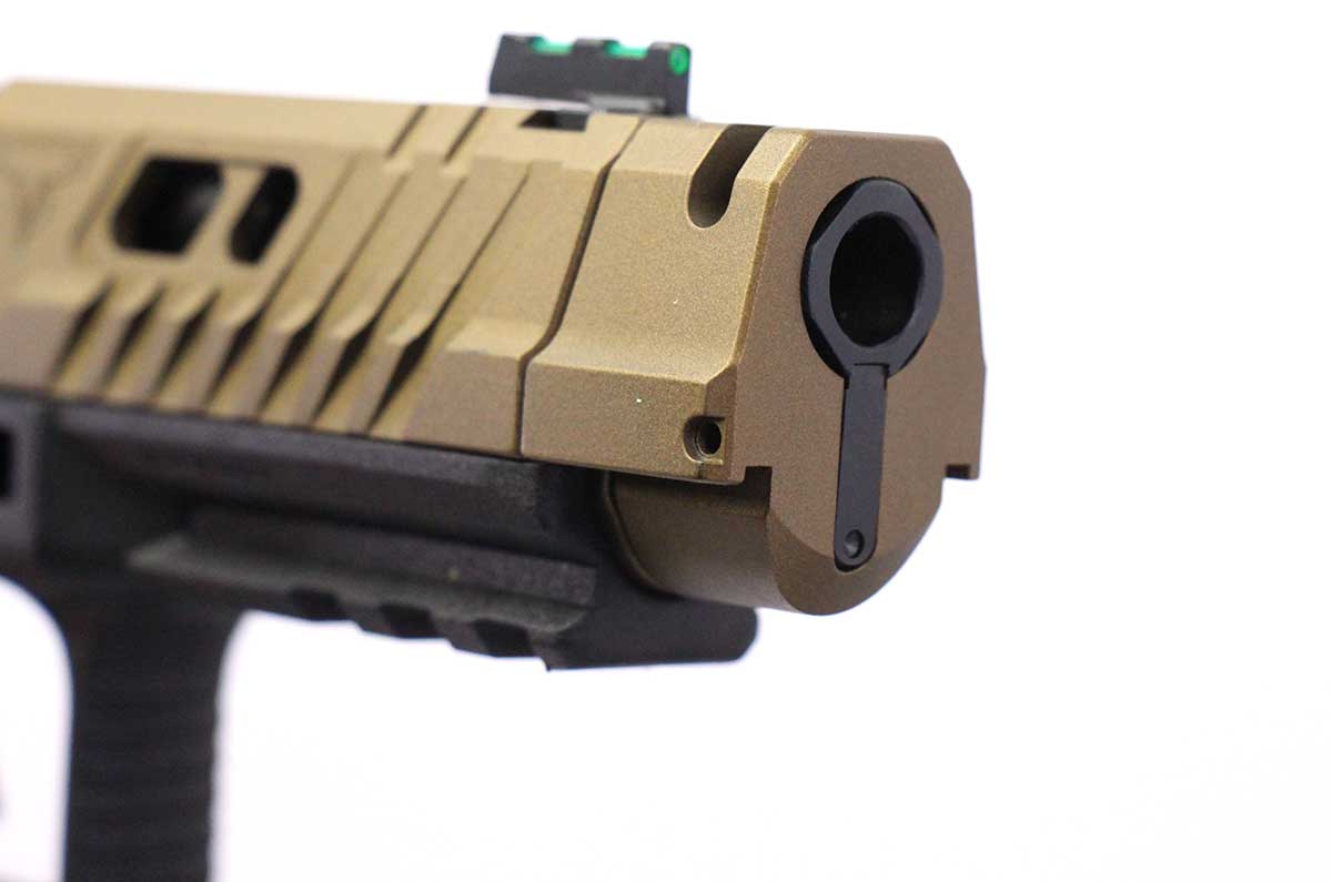 This is a used Canik TTI Combat pistol chambered in 9mm. It features a 4.6-inch fluted barrel with compensator, 18-round magazines with +3 extension, fiber optic front sight, flared magwell, accessory rail, burnt bronze Cerakote finish, and MeCanik MO3 red dot sight. Includes factory box, three 18-round magazines with +3 extensions, one flush fit 18-round magazine, cleaning brush, two backstraps, challenge coin, and magazine loading tool. Overall, this pistol is in good condition with normal use wear on the slide and barrel. This would be a good choice for target shooting. Buy online today!