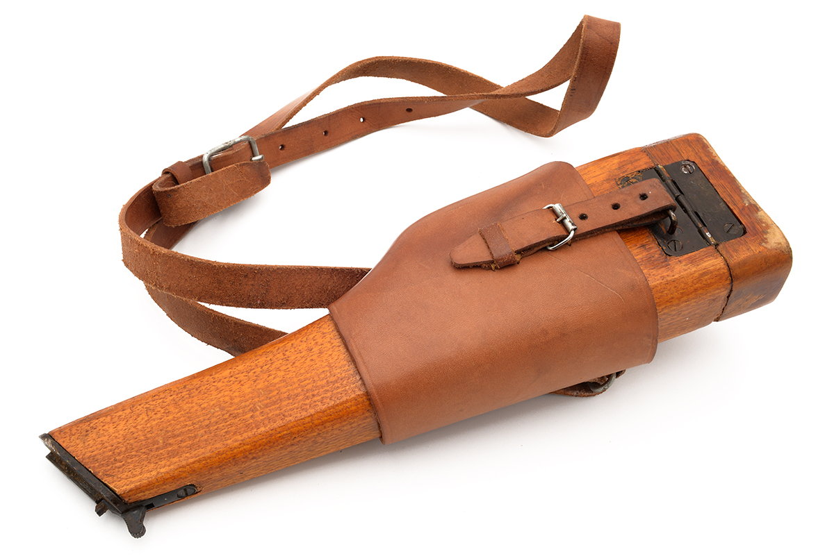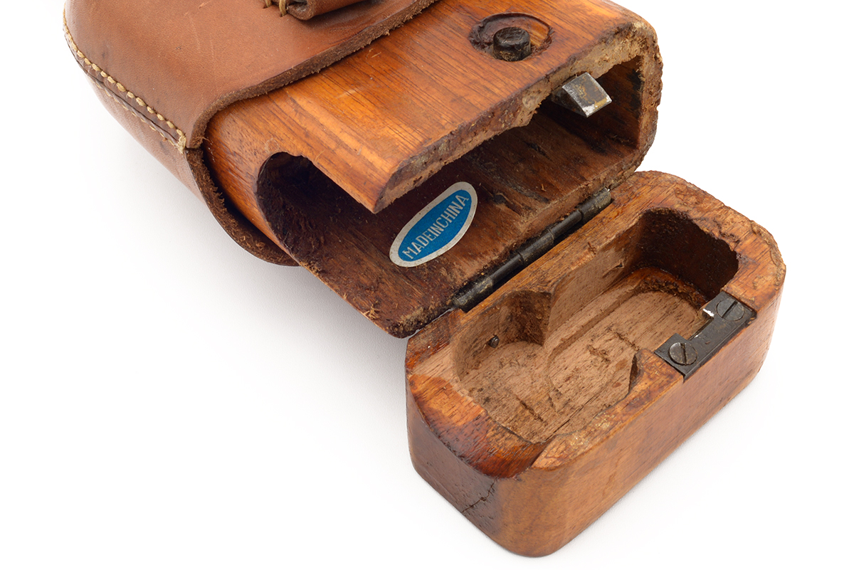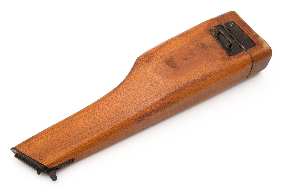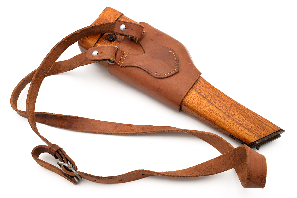 This is a Chinese reproduction of an Inglis Hi-Power shoulder stock. It features wood construction with leather straps and is marked with a sticker "MADE IN CHINA" on the sides compartment. According to author Anthony Vanderlinden's book on FN these Chinese reproduction stocks were made only as trinkets for export sales to Western countries and were not intended to be used with a gun. According to NFA rules it is illegal to attach or even possess these stocks with a handgun that it could be attached to, for this reason purchase should only be made with intent to display or complete the appropriate BATF paperwork. Overall condition is good with some scuffs and nicks to the wood, the leather has some stains. Buy online today!