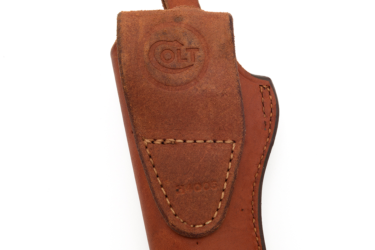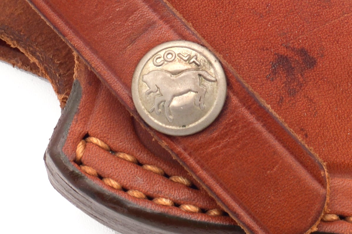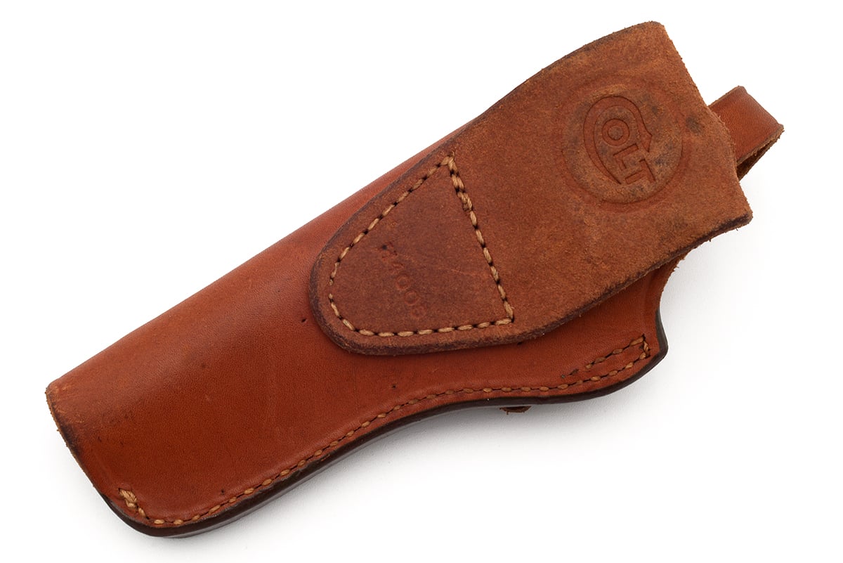 This is a scarce Colt-branded leather holster that was probably designed to fit the 4-inch Woodsman or Huntsman. It features brown leather construction with Colt logo on the snap, Colt logo on the belt loop and model number "H4005". The holster has a spine length of 6.5 inches, three inches across at widest and inside width of about one inch. It is likely that this holster was made for Colt by Wally Wolfram, but this is not definitive. Overall condition is good with some scuffs, scratches and stains. Buy online today!
