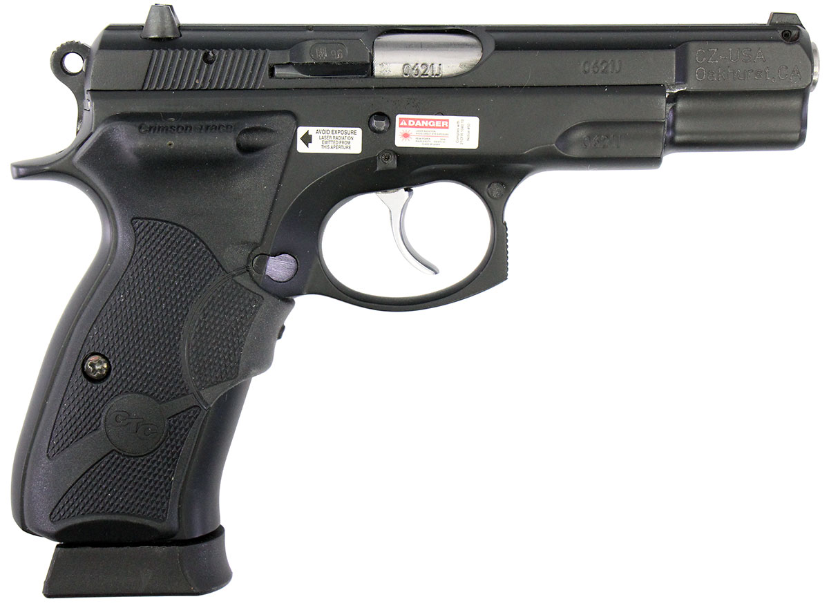 This is a used CZ 75B pistol chambered in 9mm. It features a 4.6-inch barrel, 18-round magazines, fixed sights, Crimson Trace red laser grips, and thumb safety. Includes factory box, two magazines, and a set of OEM black plastic grips. Overall, this CZ is in good condition with normal use wear on the slide and barrel. This would be a good choice for target shooting. Buy online today!