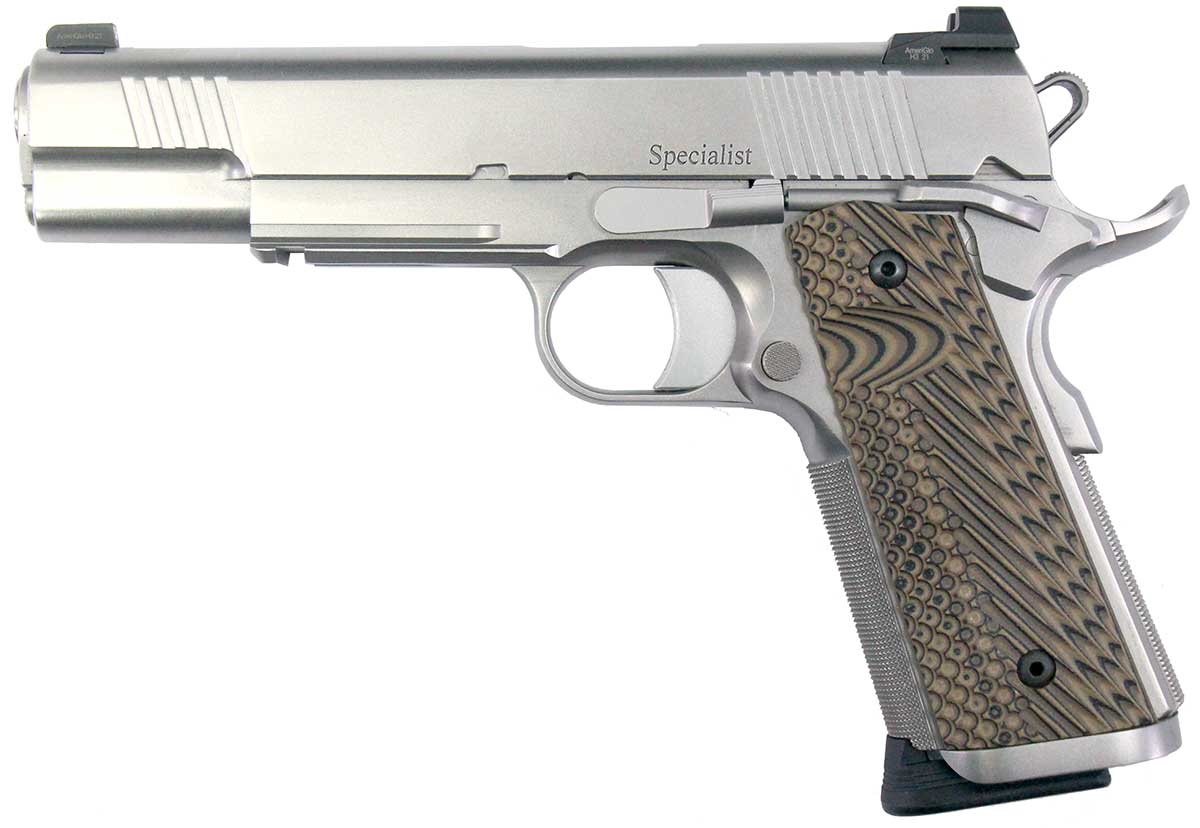 This is a used Dan Wesson Specialist pistol chambered in 45 ACP. It features a 5-inch barrel, 8-round magazines, night sights, ambidextrous thumb safety, grip safety, flared magwell, accessory rail, G10 grips, and stainless finish. Includes factory box, manual, and two magazines. Overall, this pistol is in very good condition with minimal wear. This would be a great choice for home defense. Buy online today!