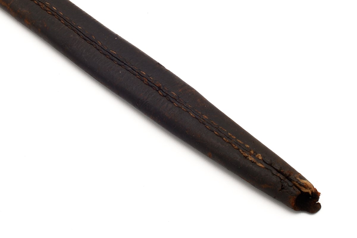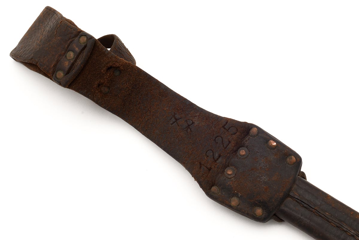 This is a Dutch M1895 Infantry bayonet for M95 Mannlicher (M1895) rifle. It features a 14" "T-back" blade and an overall length of 18.75", it is marked "HEMBRUG" (Nederlands Staatsarsenaal) on side of the ricasso and "E" under a crown inspector stamp on the other side. Overall condition is good with the original unsharpened edge, the metal has some wear, light rust and patina, the wood grips have some dings and nicks. The leather scabbard is in poor condition with a piece of the tip missing, there are scuffs, wear and cracking but still soft. Buy online today!