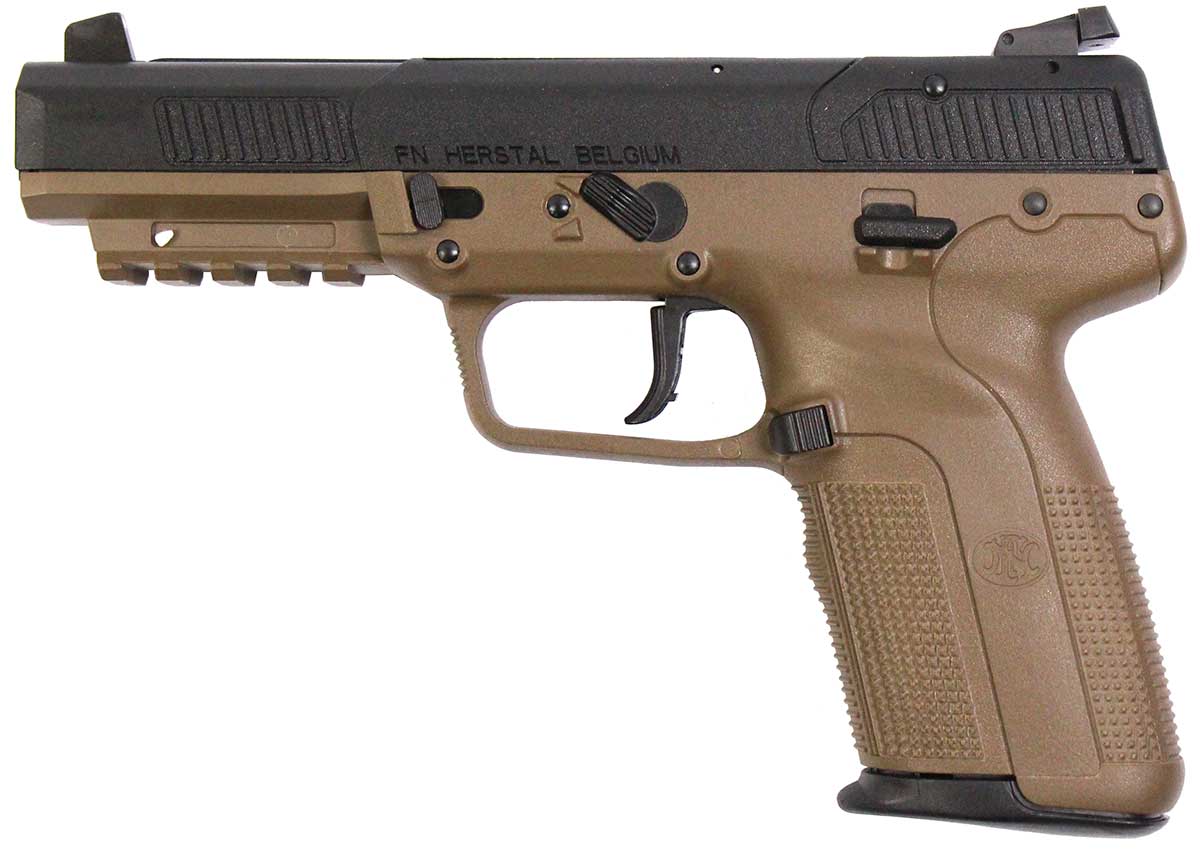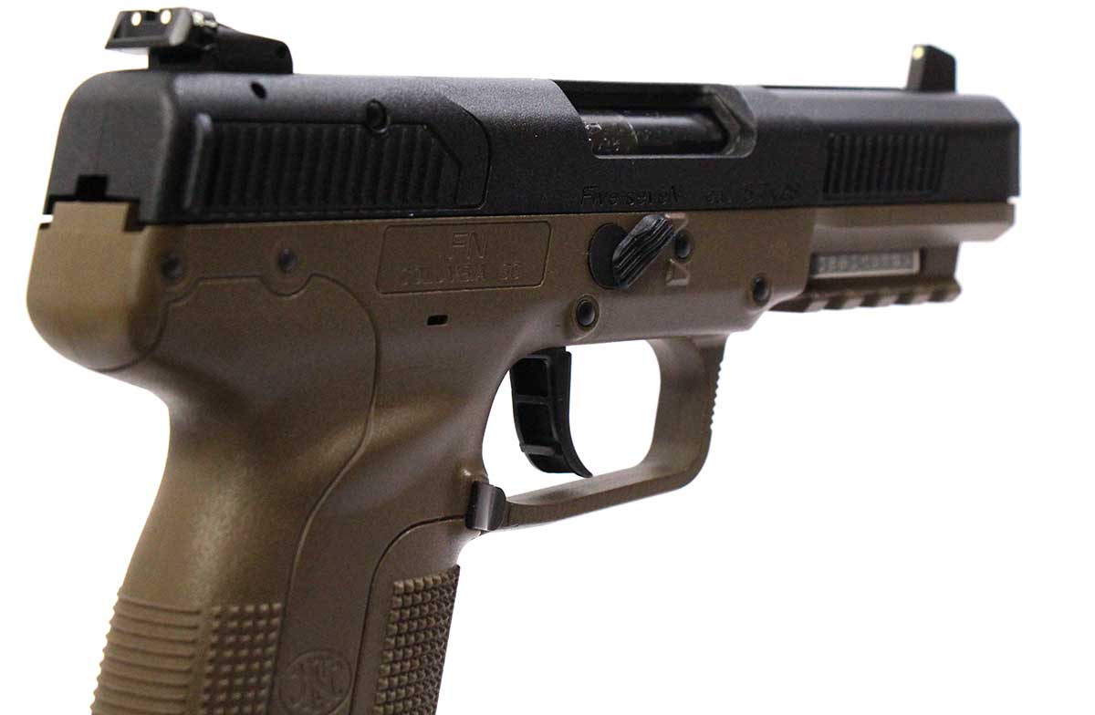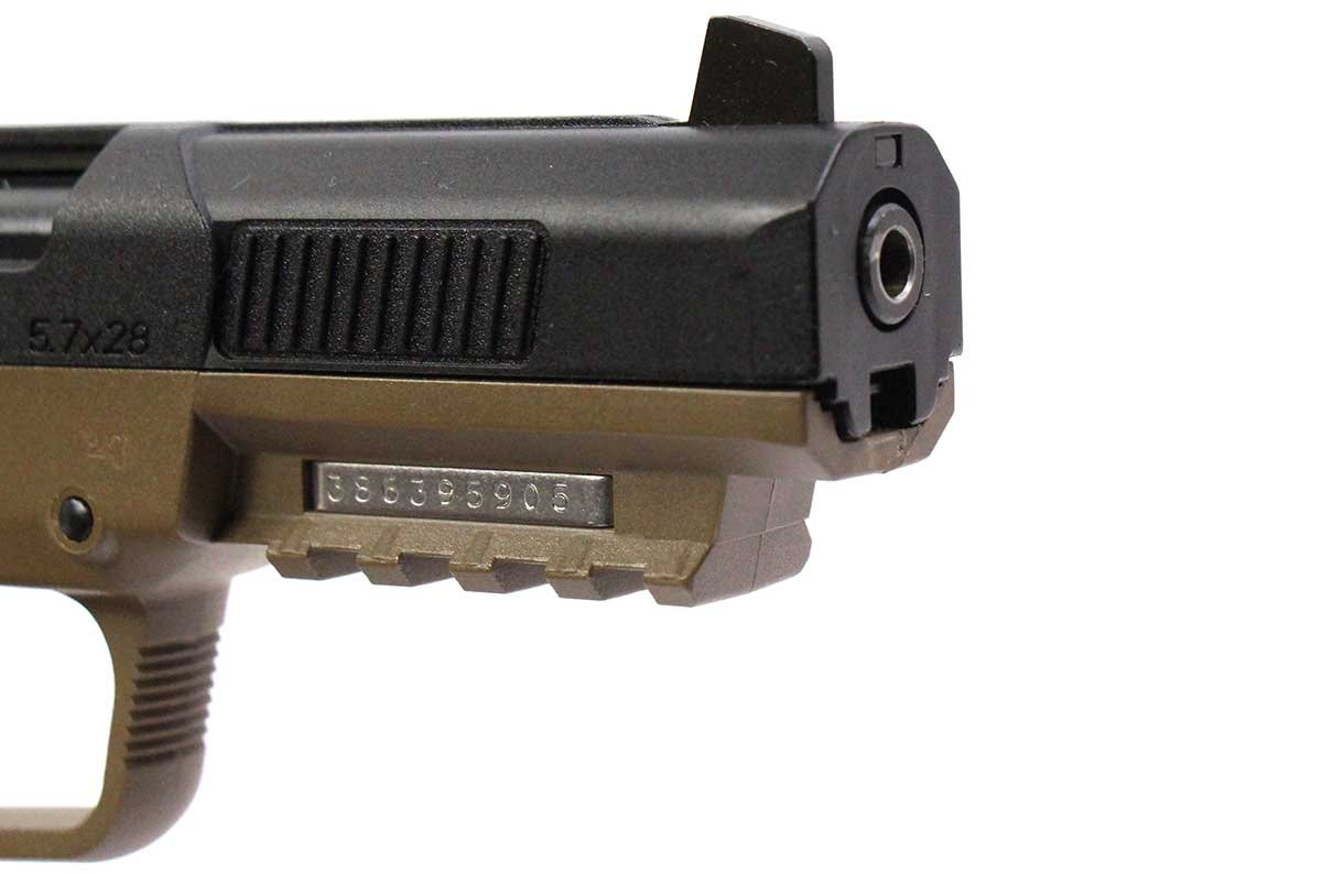 This is a used FN Fiveseven MKII pistol chambered in 5.7x28mm. It features a 4.75-inch barrel, 20-round magazines, thumb safety, magazine disconnect safety, accessory rail, flat dark earth frame, and adjustable rear sight. Includes factory box, two magazines, and manual. Overall, this FN is in very good condition with minimal wear. This would be a great choice for target shooting or personal protection. Buy online today!