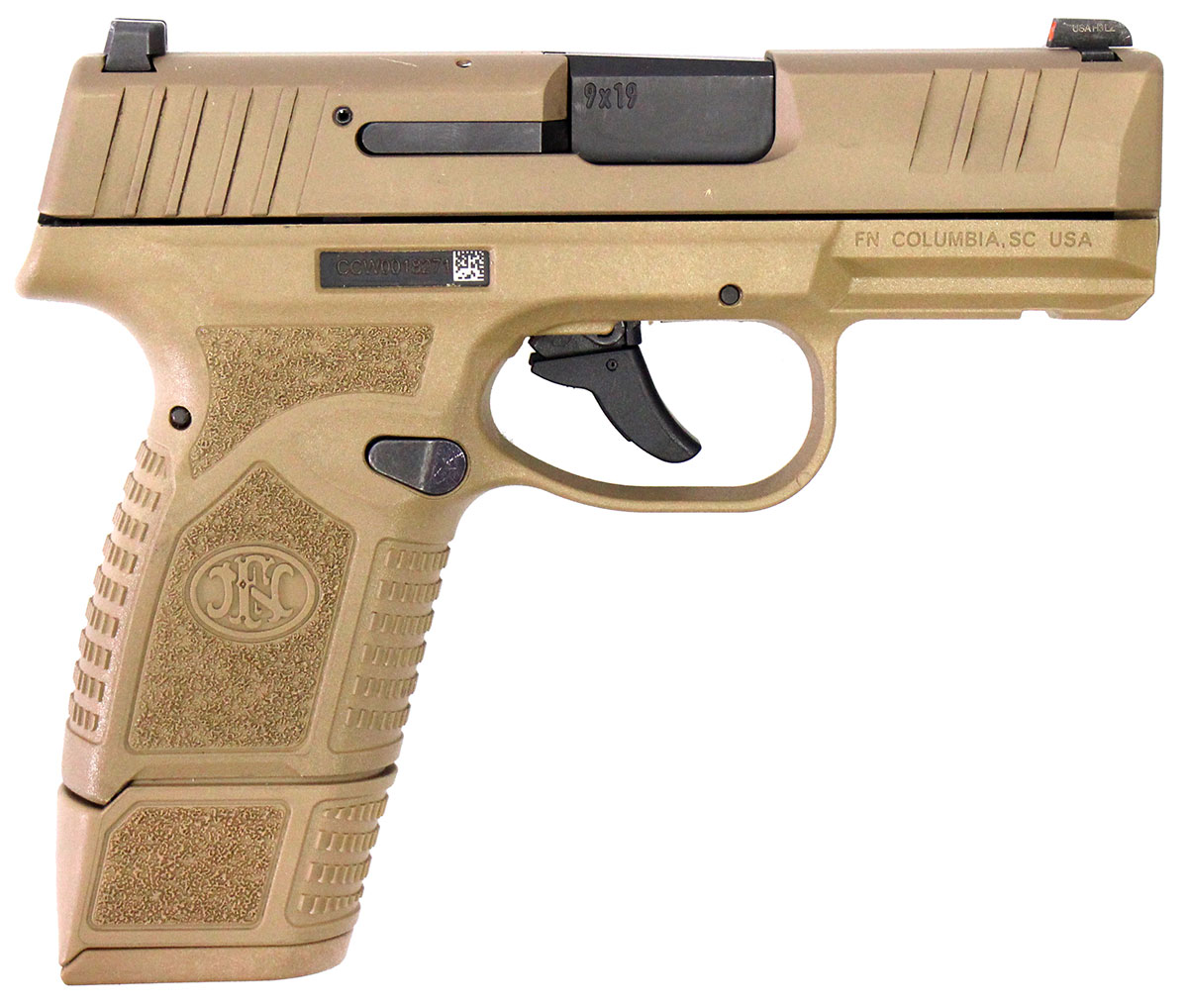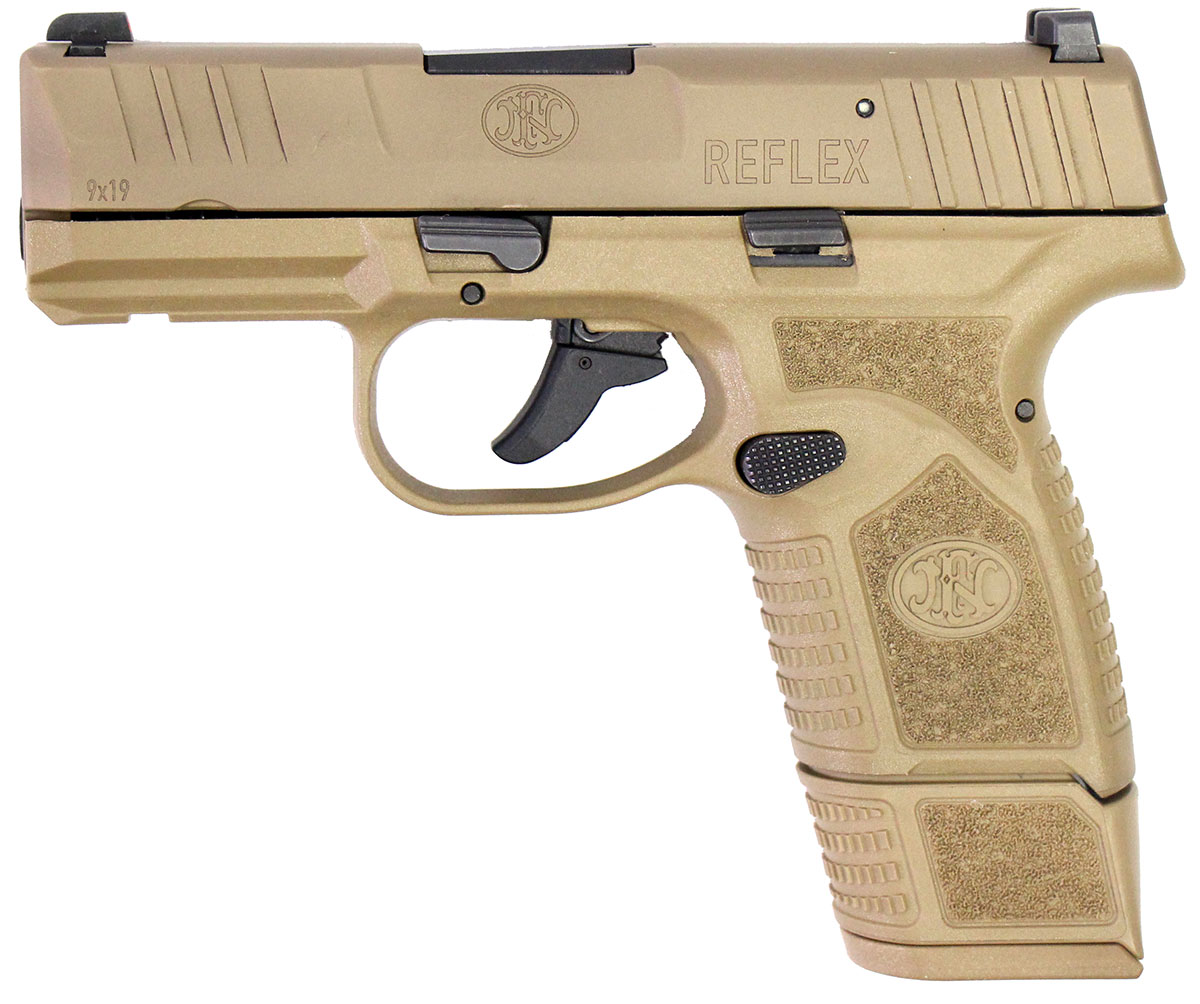 This is a used FN Reflex pistol chambered in 9mm. It features a 3.3-inch barrel, 15-round magazine capacity, fixed sights, accessory rail, and flat dark earth finish. Includes factory box, instruction manual, one 11-round magazine, and one 15-round magazine. Overall, this FN is in good condition with normal use wear on the slide and barrel. The tritium in the front sight is dim. This would be a good choice for home defense. Buy online today!