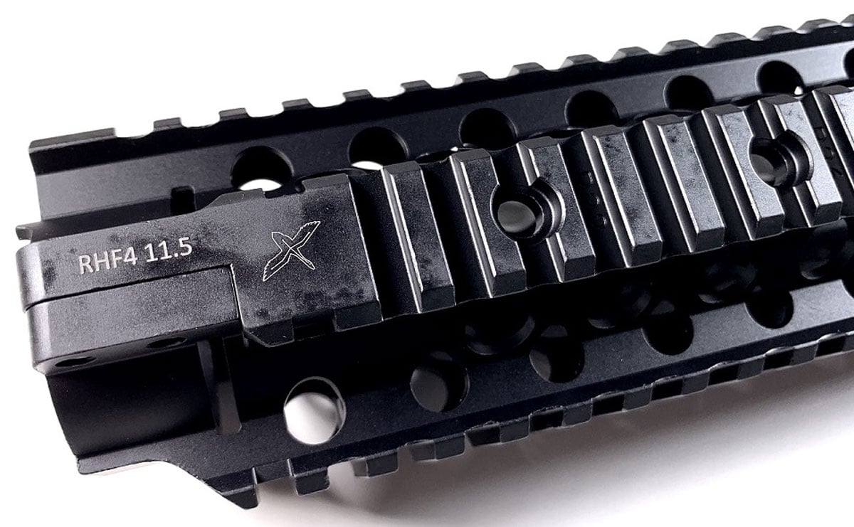 RHF4 incorporates Forward Controls design input: Omission of built-in QD swivel attachment points. Some like the now common front and rear located QD sockets, we prefer the location of the front sling attachment be left to individual users. A QD swivel can be ordered with RHF4 as an option. The rail numbers are machine engraved, and a subdued Cygnus is engraved on the right side of the RHF4.