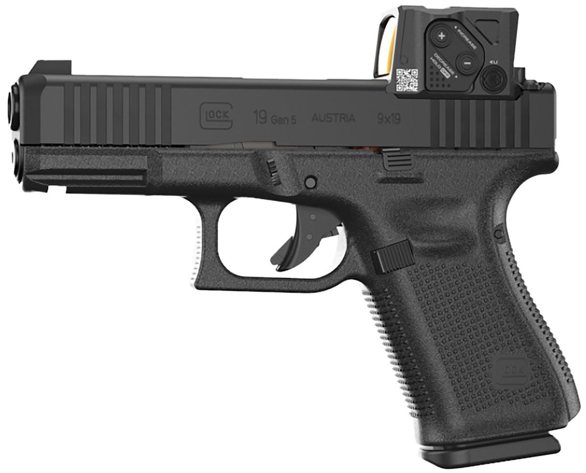 GLOCK, 19 M.O.S., Gen 5, Striker Fired, Polymer Frame Pistol, Compact, 9MM, 4.02" Marksman Barrel, nDLC Finish, Black, MOS8 Optic Cut, Aimpoint COA Optic Mounted, Black Front Sight, Rear Wedge Sight, Front Serrations, Ambidextrous Slide Stop Lever, Flared Mag Well, No Finger Grooves, 15 Rounds, 3 Magazines. The leading global manufacturer of pistols and the pioneer of red dot sights delivers an exclusive package: the GLOCK Pistol with Aimpoint COA Combo. The exclusive package features select GLOCK pistols with A-CUT Interface and the ultra-compact Aimpoint COA optic installed. The direct mounting enables a deep setting for extreme stability and durability.