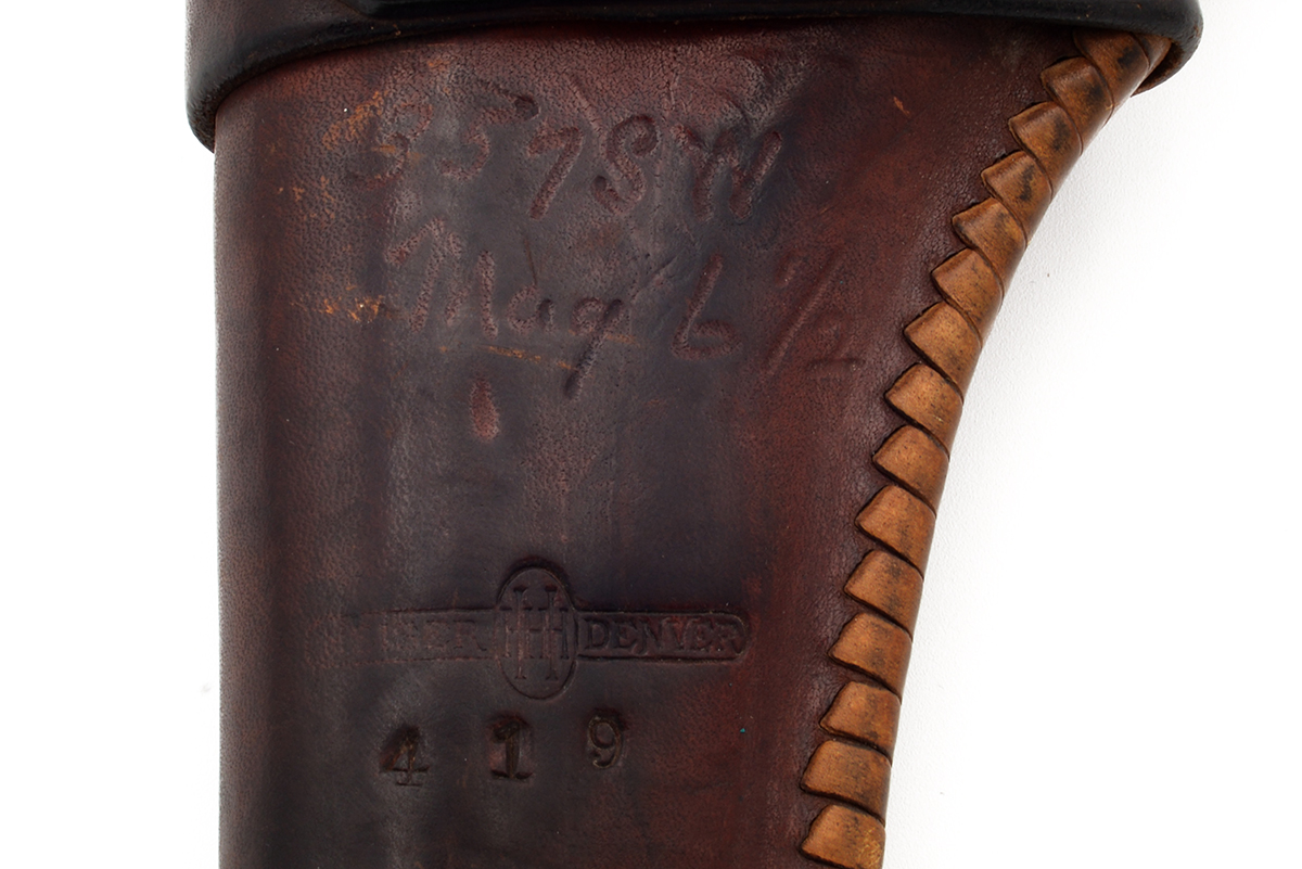 This is a vintage H.H. Heiser Denver leather holster Model 419. It features leather construction, right handed carry with brass button snap marked "HEISER DENVER". The back of the holster is etched "357 SW MAG 6 1/2", "HEISER DENVER" logo over "419". Overall condition is good with strong lacing, there is some wear, scuffs and scratches along with green oxidation around the snap. This holster most likely dates to the late 1930's to 1940's era. Buy online today!