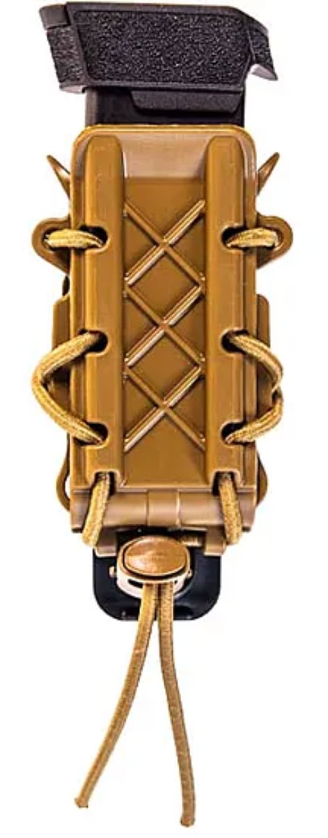 Rugged and flexible proprietary polymer and bungee cord combine to create this versatile High Speed Gear Polymer MINI Pistol TACO Univ Mount. For ease of use, these Pistol Magazine Pouches created by High Speed Gear mount to both MOLLE and belts up to 2in with their new HSGI Clips. This High Speed Gear Polymer MINI Double Stack Pistol TACO will blend seamlessly with your gear since the pop lock configuration keeps excess shock cord down and out of the way, preventing snagging or annoying loose cords. Beyond holding short double stack mags of many calibers, these pouches are also suitable for small tools, flashlights and other accessories. While this mount won't protect the inserted objects from water damage, the mounts themselves are completely waterproof with a grommet on the bottom for drainage. Equip a High Speed Gear Polymer MINI Pistol TACO Mag Carrier to stay as prepared as possible on hunts, the range or in the field.