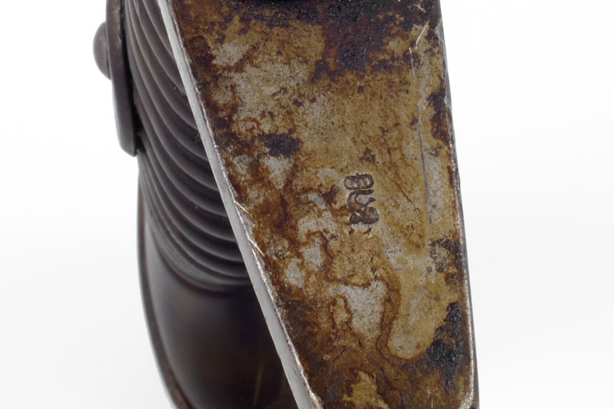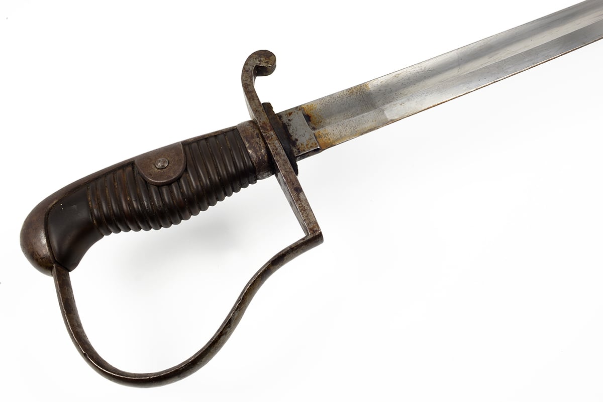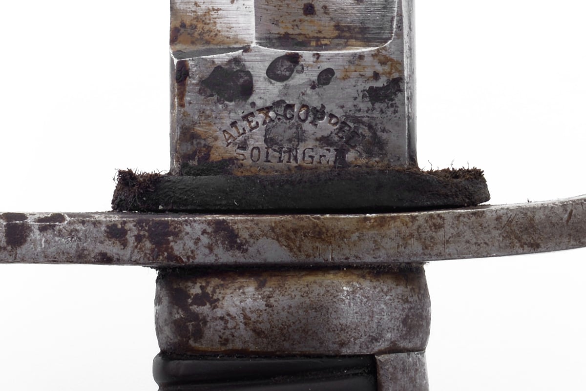 This is an Imperial German (Wurttemberg) WW1 Model 1 Artillery Sword. It features a 30" blade and total length of 35.75" with ribbed celluloid grip, the ricasso is marked "ALEX COPPEL SOLIGEN" and the spine is dated "14" with Imperial proof marks. Overall condition of this sword is good, the blade has some light tarnishing and spots of corrosion but the edge is probably original. The guard has a fair bit of patina and rust but the celluloid grip is in very nice shape. There is no scabbard included with this sword. Buy online today!