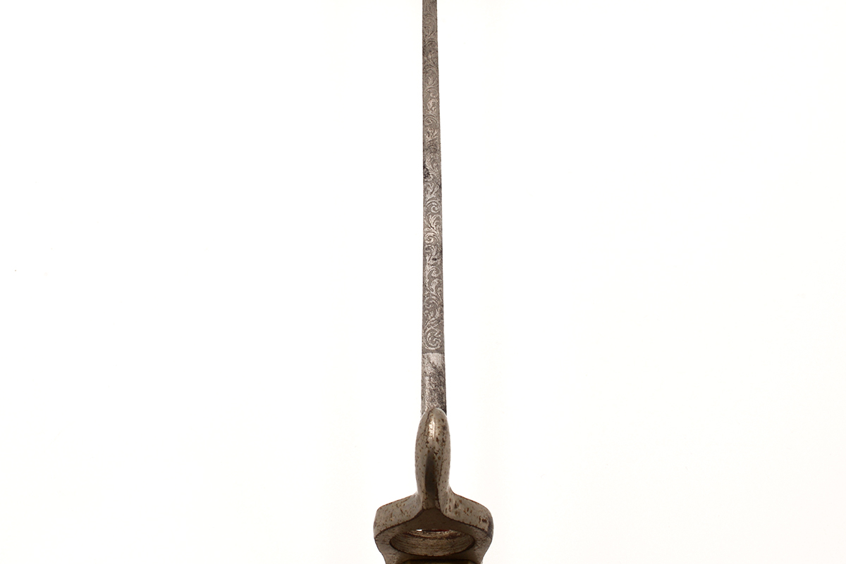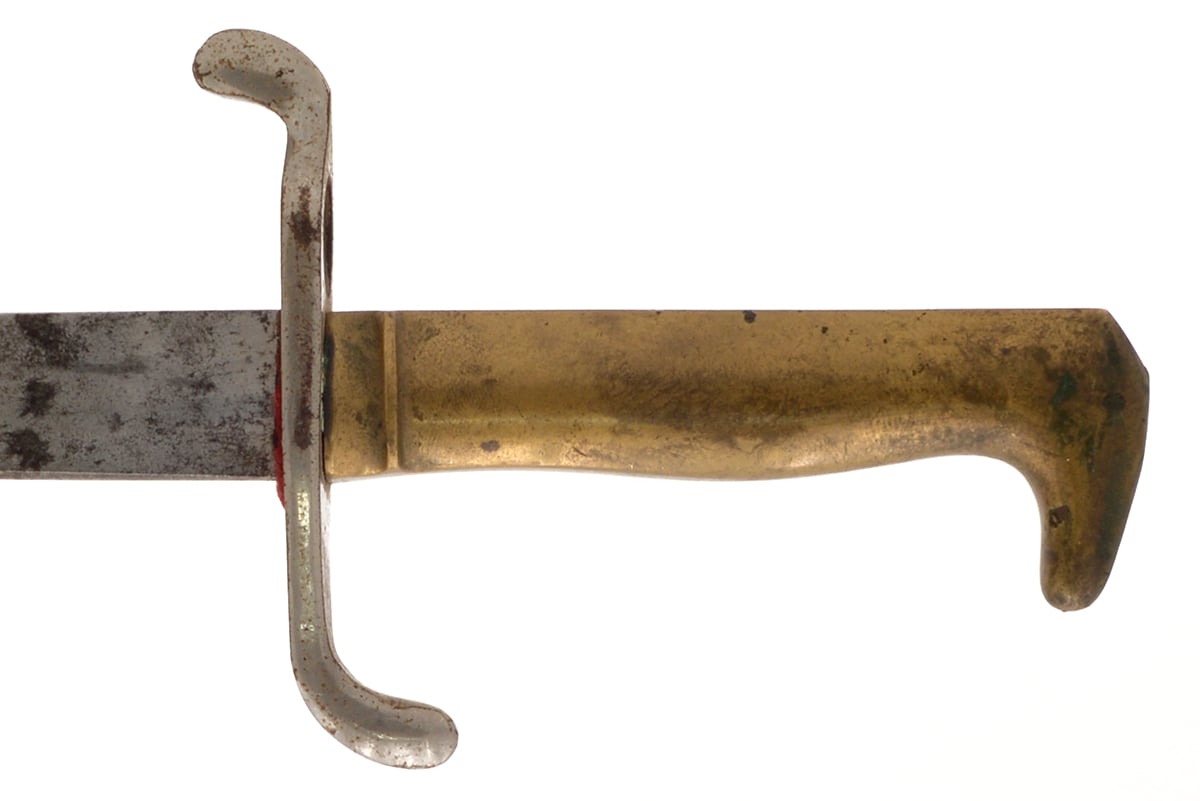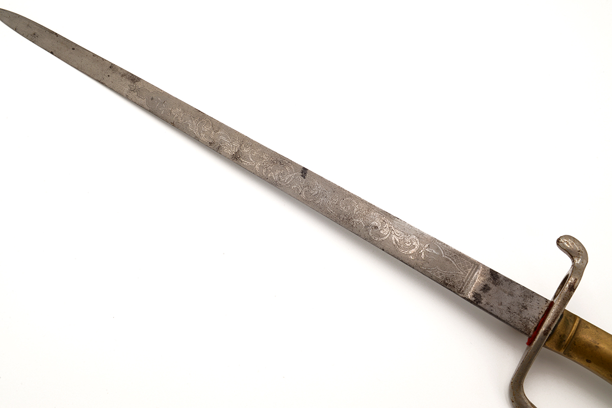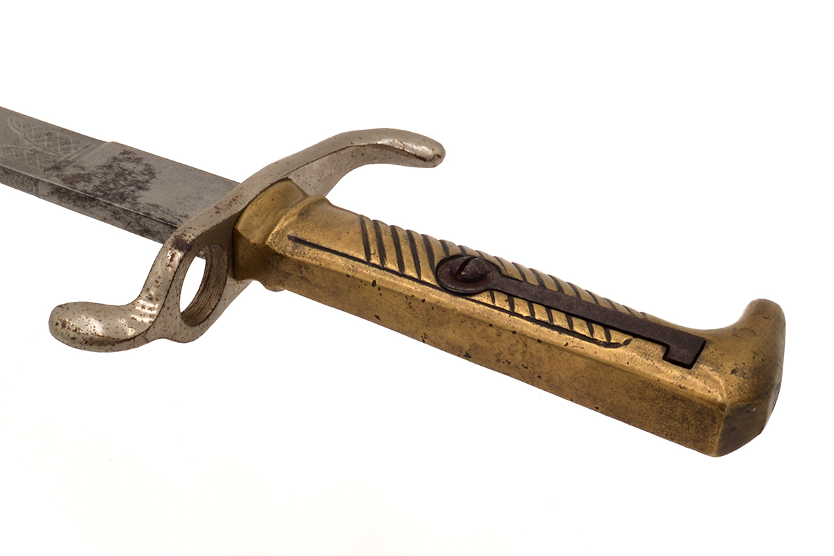 This is an original Imperial German WWI M1871 "Walking Out" etched parade dress bayonet. It features an 19.25" etched blade with brass handle and overall length of 23.5", it marked on the blade "MIT GOTT FÜR KAISER UND REICH" which translates to "With God for Emperor and Country". The hilt does have the inlet leaf spring on the right side but there is no lug slot on top, these "Walking Out" bayonets were manufactured only for show and never intended to be attached to the Mauser 1871 rifle. Overall condition is good with the original unsharpened edge, there is some tarnishing to the blade and handle along with some patina. Buy online today!