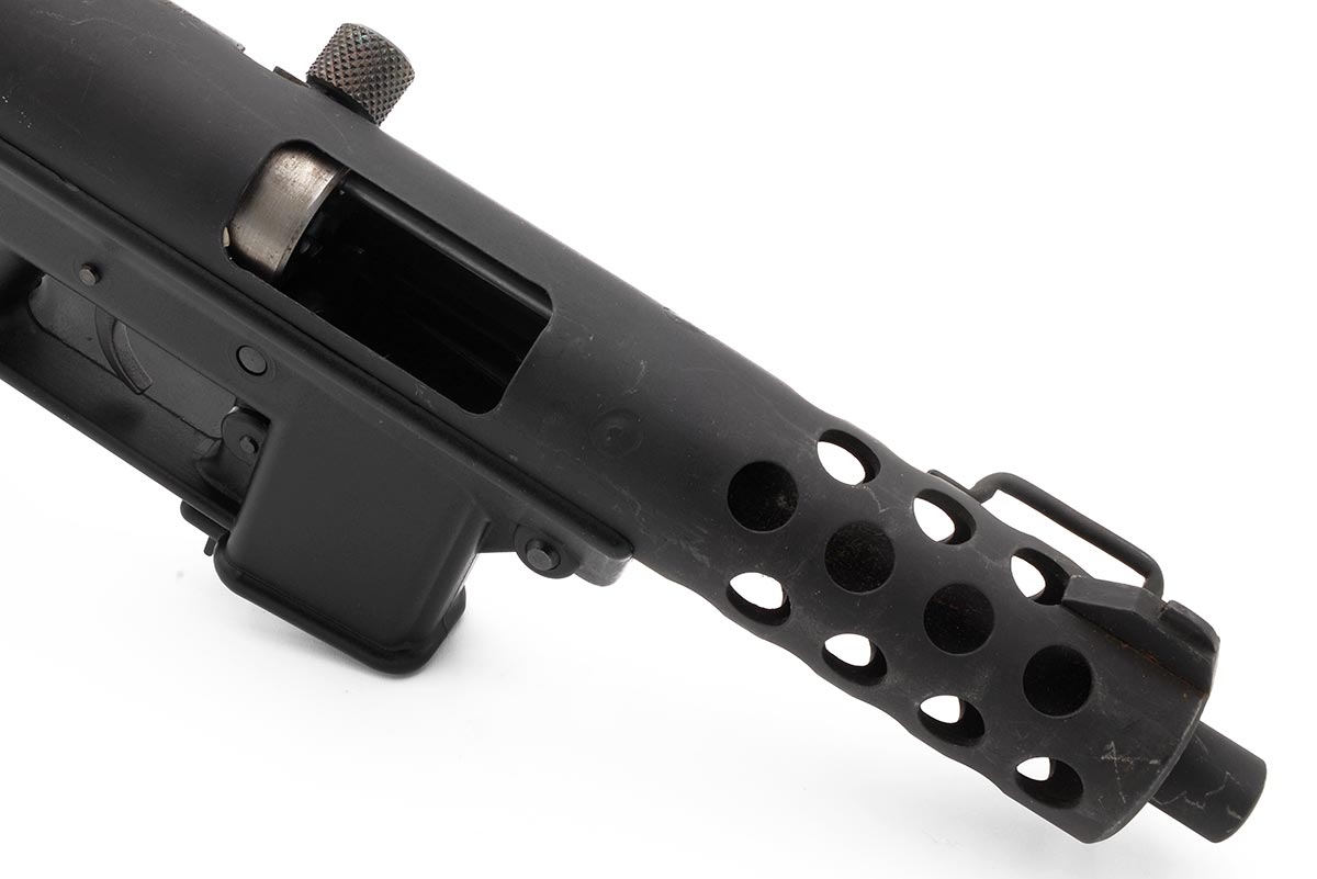 This is an extremely rare pre-ban Interdynamic (Intratec) KG-9 pistol chambered in 9mm. It features a 5-inch barrel, steel upper with parkerized/phosphate finish and polymer lower. This is a very early example that uses the original open-bolt action. The open-bolt design only allows for the use of 115 grain 9mm ammunition. Heavier grain ammunition or hot loads the plastic lower receiver can fail or crack. Interdynamic redesigned the pistol after the BATF ban and developed the KG-99 which used a closed-bolt action. Overall condition is good with a bright bore and strong rifling. There is some minor wear and light scratches to the upper. Included is the original box, manual and one factory 32-round magazine. This would be a great addition to any rare firearm collection. Buy online today!
