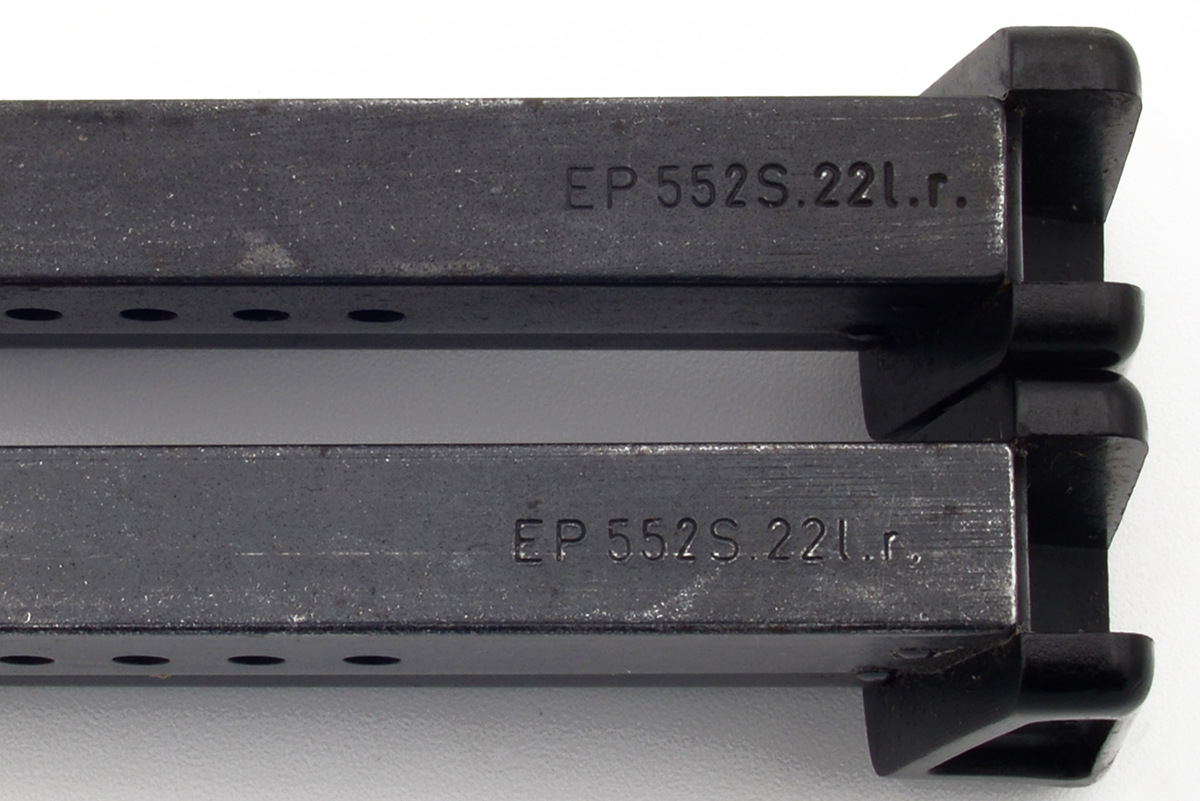 These are Iver Johnson TP22 (TP-22) factory magazines. They feature a 7 round capacity of 22LR ammo with chrome followers and plastic bases, the spines are marked "EP 552S.22l.r. Overall condition of these magazines is good with some light wear and spotting of patina. You will receive both magazines pictured here with your purchase. Buy online today!