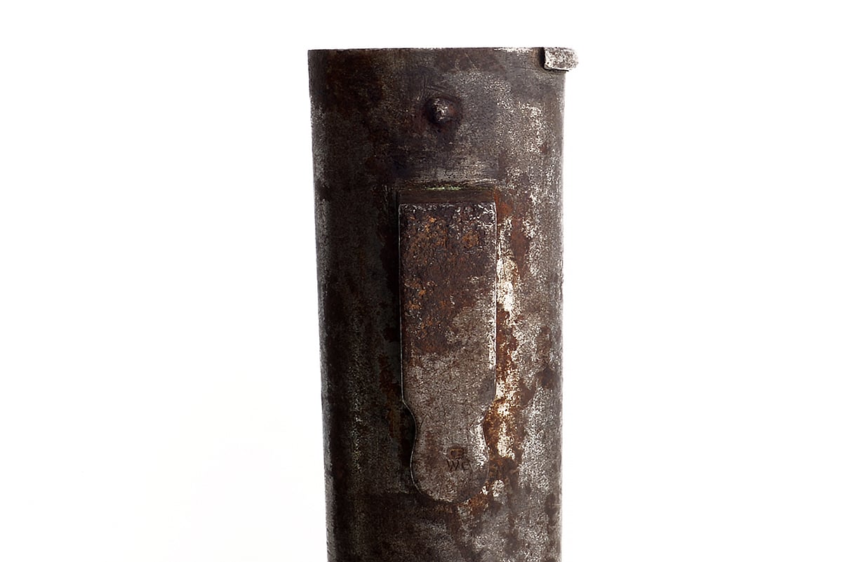 This is a Portugese M1885 bayonet By made by Steyr for the Kropatshek rifle. It features an 18.5 blade and total length of 23.5", the spine marking is very difficult to read but appears to say "Steyr 1886". Overall condition of the bayonet is fair with the original edge, there is corrosion, patina and some light rust, the wood grips have some chips and nicks. The scabbard is in poor condition with quite a bit of corrosion, rust and pitting, the number on it does not match the bayonet. Buy online today!