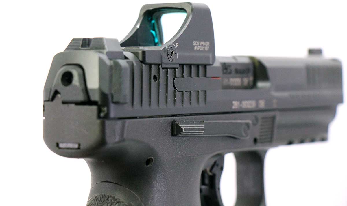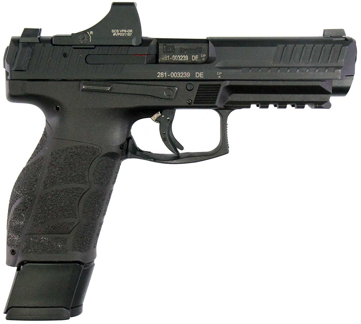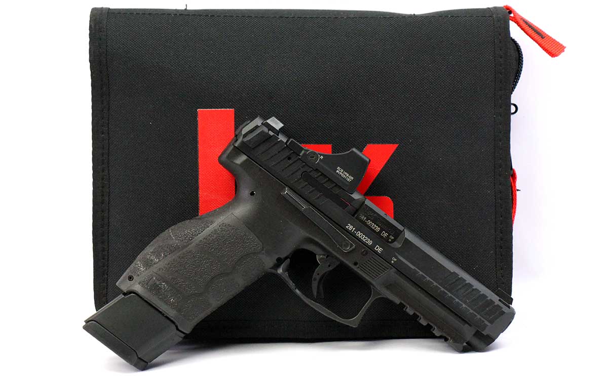 This is a used Heckler & Koch VP9A1-F pistol chambered in 9mm. it features a 4.53-inch barrel, 20-round magazine, fixed sights, paddle magazine release, Holosun SCS VP9 green dot sight, and accessory rail. Includes nylon case, manual, two 17-round magazines, and one 20-round magazine. Overall, this pistol is in good condition with normal use wear on the slide and barrel. This would be a good choice for target shooting. Buy online