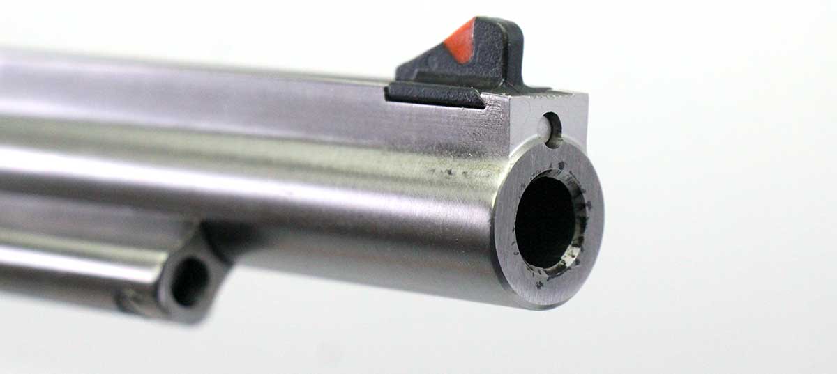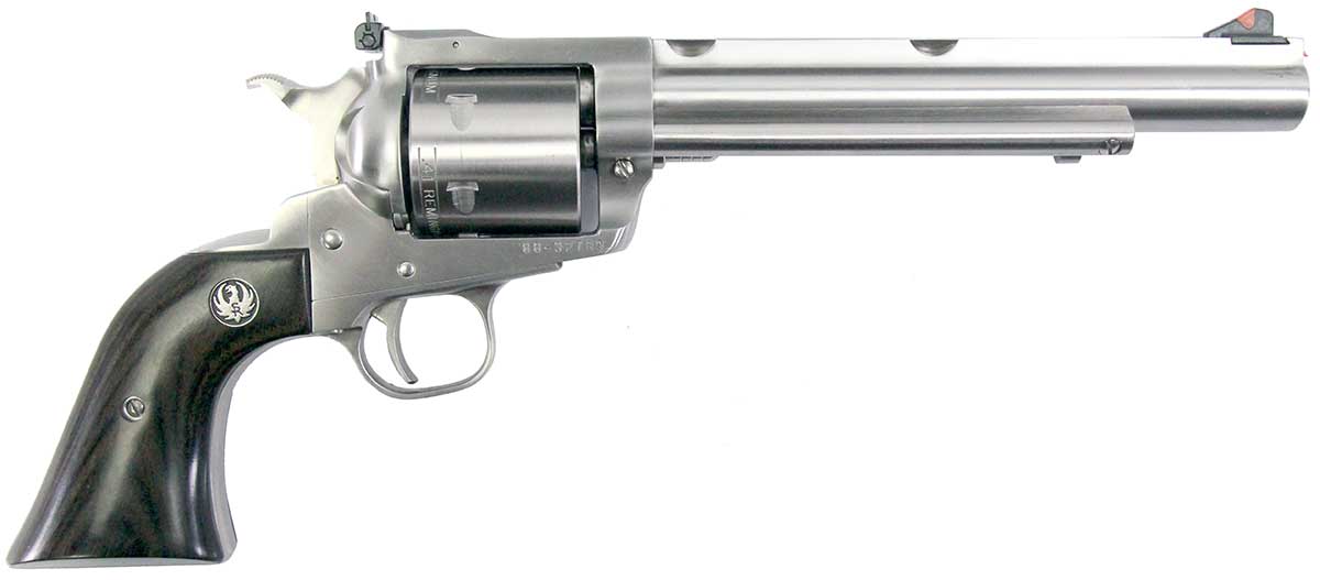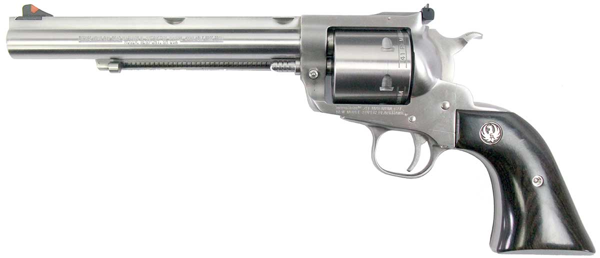 This is a used Ruger New Model Super Blackhawk Hunter revolver chambered in 41 Magnum. It features a 7.5-inch barrel, 6-round cylinder, transfer bar safety, red ramp front sight, adjustable rear sight, wood grips, and stainless finish. Includes factory box and manual. Overall, this Ruger is in good condition with normal cylinder turn lines. This would be a good choice for target shooting or hunting. Buy online today!