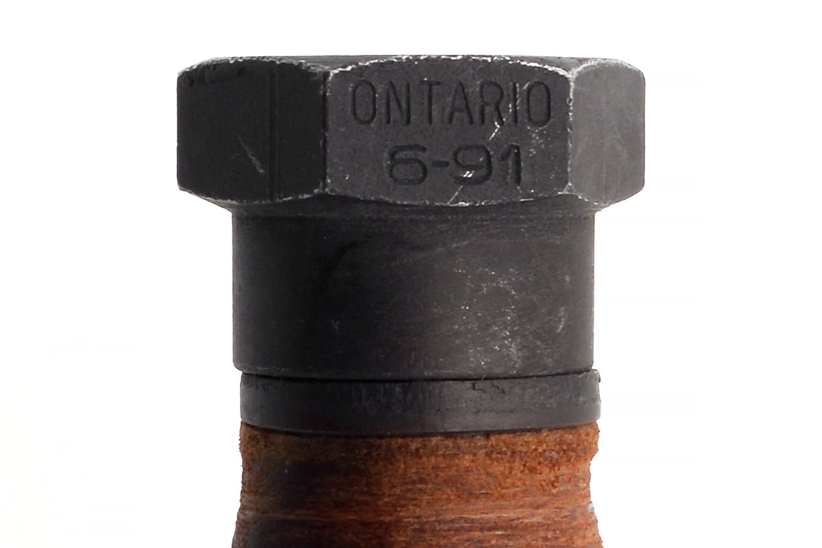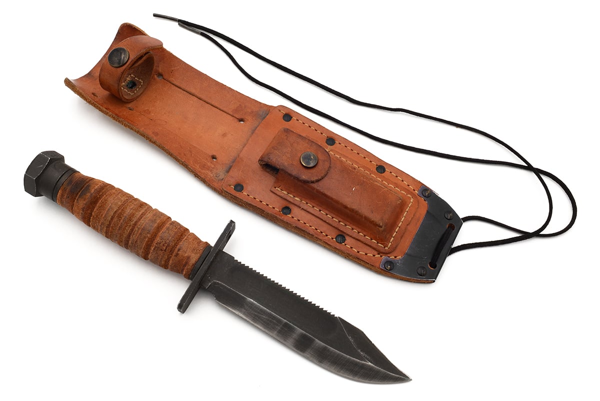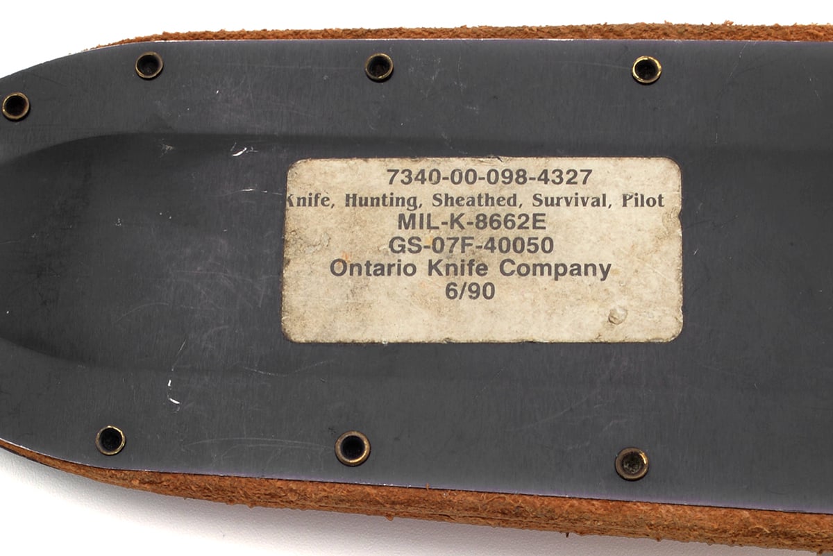 This is an Ontario military pilots survival knife. It features a 5" blade and total length of 9.5", the pommel is marked "ONTARIO 6-91" indicating a 1991 manufacture date and the sheath is dated 1990. Overall condition is good with some wear, scuffs and scratches to the finish along with some stains to the leather grip. The sheath is in nice shape with some wear and scuffs to the leather. Buy online today!
