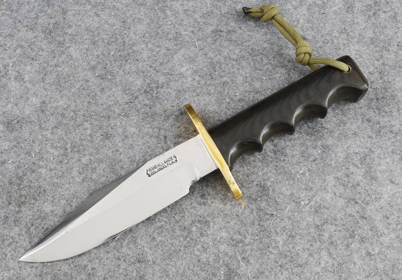 Top cutting edge sharpened. 4 1/2" Black Micarta handle. Forward curved hilt, nickel silver hilt. Construction same as Model 14 except shorter blade. Comes with standard Black Micarta finger grip handle. Designed especially for air crew survival and combat purposes in cooperation with U.S. Marine Corps Equipment Board. This specfic Model 15 was used in operation desert storm by a two-time bronze star recipient.