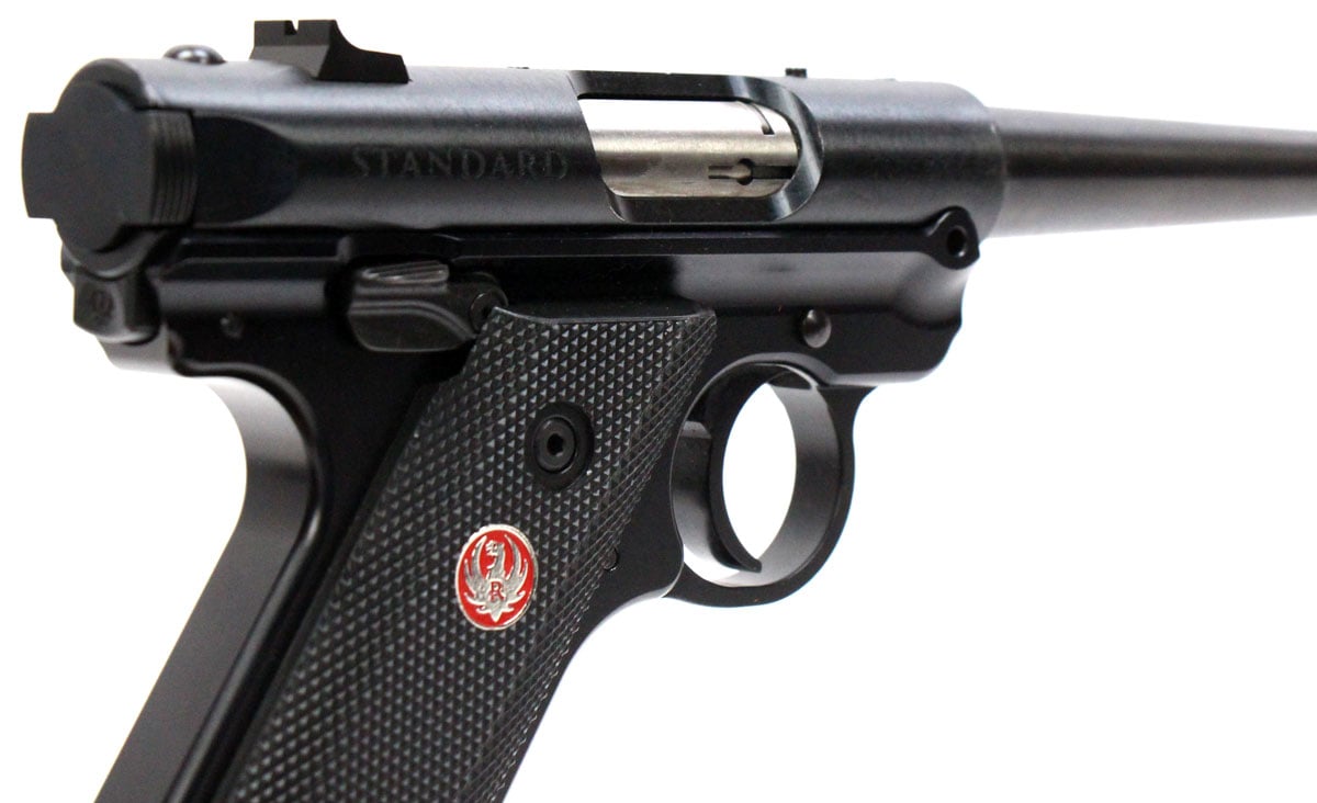 This is a used Ruger MKIV Standard pistol chambered in 22 Long Rifle. It features a 6-inch barrel, 10-round magazine, fixed sights, ambidextrous manual safety, magazine disconnect safety, and alloy frame. Includes factory box, manual, and two magazines. Overall, this pistol is in good condition with some handling wear on the barrel. This would be a good choice for target shooting. Buy online today!