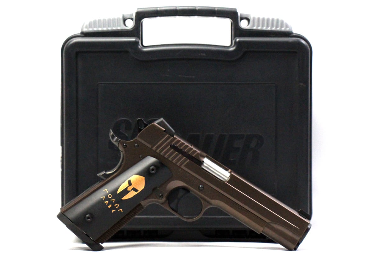 This is a used Sig Sauer 1911 Spartan pistol chambered in 10mm. It features a 5-inch barrel, 8-round magazines, night sights, grip safety, thumb safety, and burnt bronze finish. Includes factory box and two magazines. Overall, this pistol is in good condition with normal use wear on the barrel. This would be a good choice for target shooting. Buy online today!