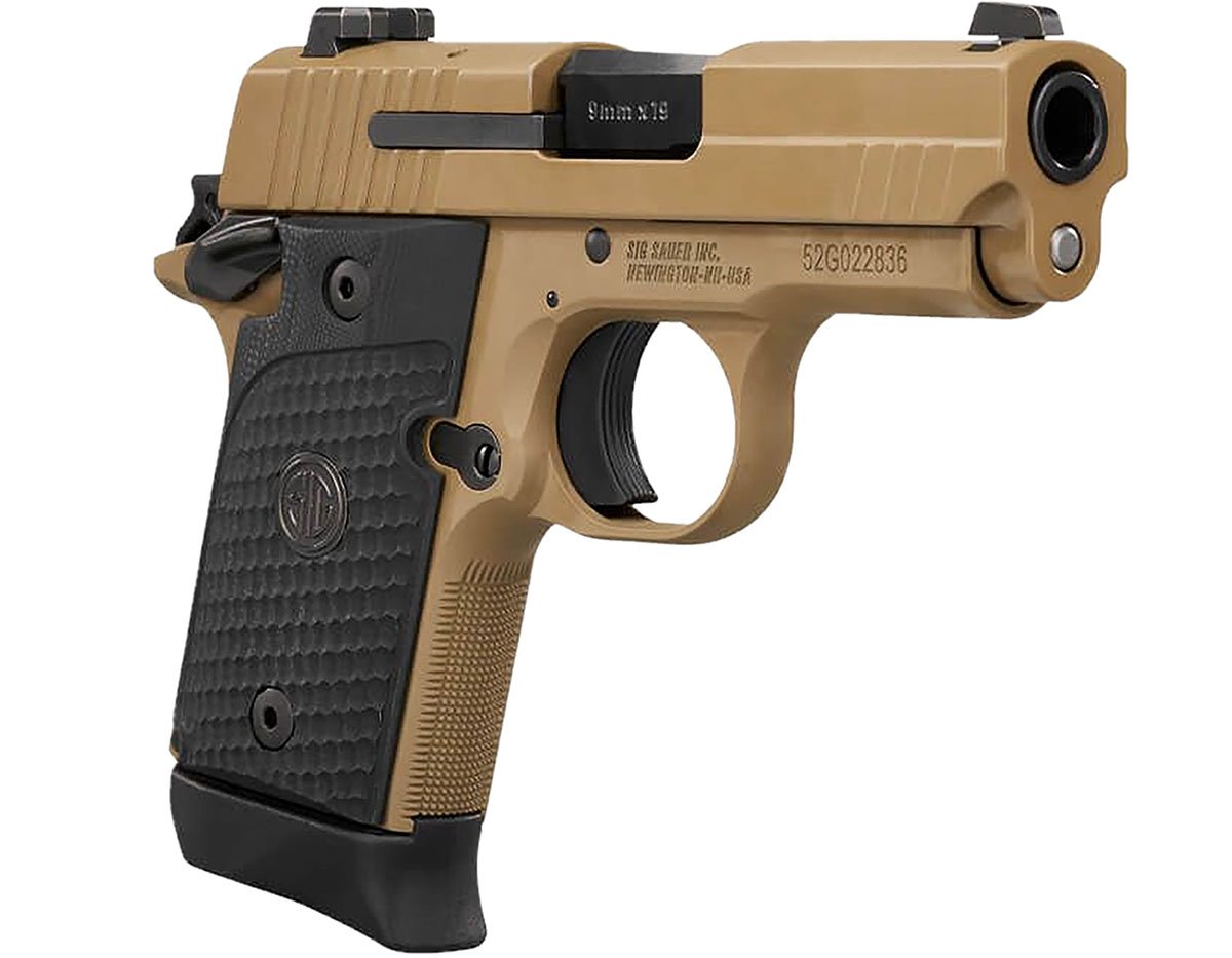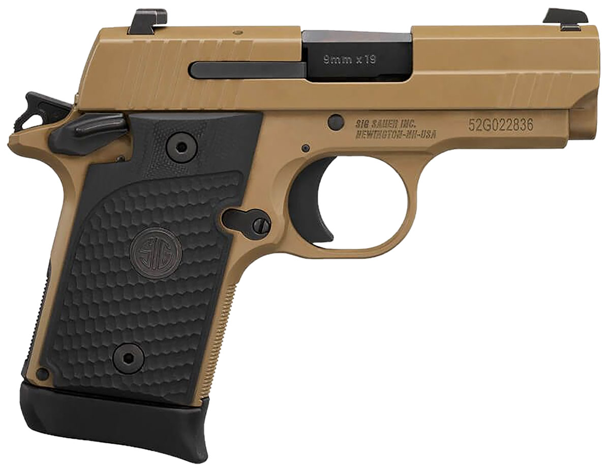 Sig's pistols are engineered to perform anywhere, at any time, and under any circumstance. They boast unique, advanced features that stand out among the rest. The P938 microcompact is inspired by the P238, but is still easy to conceal and even easier to shoot. The P938 Micro-Compact Emperor Scorpion model features an all-metal frame and longer slide and barrel. The cocked-and-locked single-action trigger gives the P938 unmatched accuracy, while the ambidextrous safety makes it easy for left- and right-handed shooters. This model has a carbon steel barrel, aluminum alloy frame with a PVD FDE finish, stainless steel slide with a FDE finish, SigLite night sights, G-10 Piranha grip, and comes with one 6-round and one 7-round magazine.
