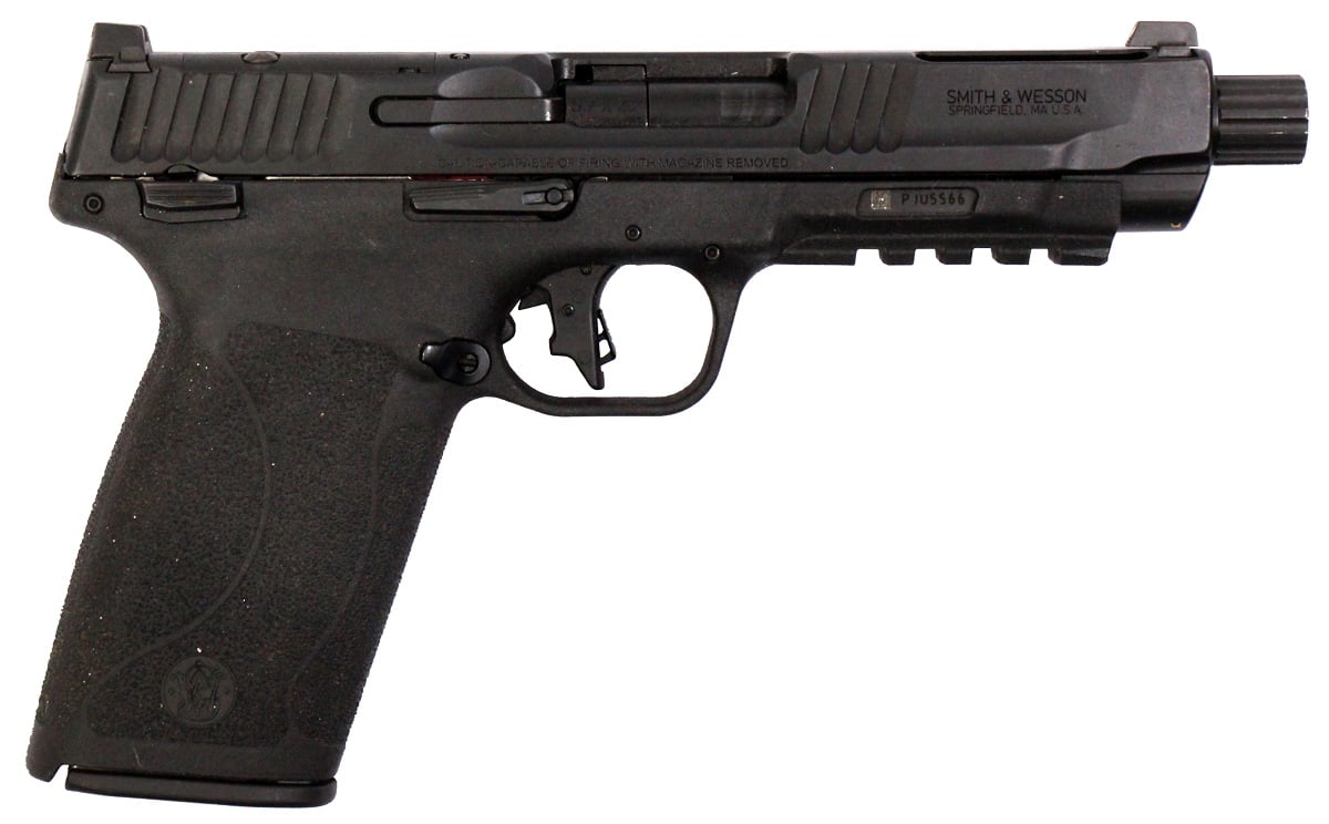 This is a used Smith & Wesson M&P 5.7 pistol chambered in 5.7x28mm. It features a 5-inch threaded barrel, 22-round magazine, 3-dot sights, and accessory rail. Overall, this Smith is in good condition with normal wear on the slide and barrel. This would be a good choice for target shooting. Buy online today!