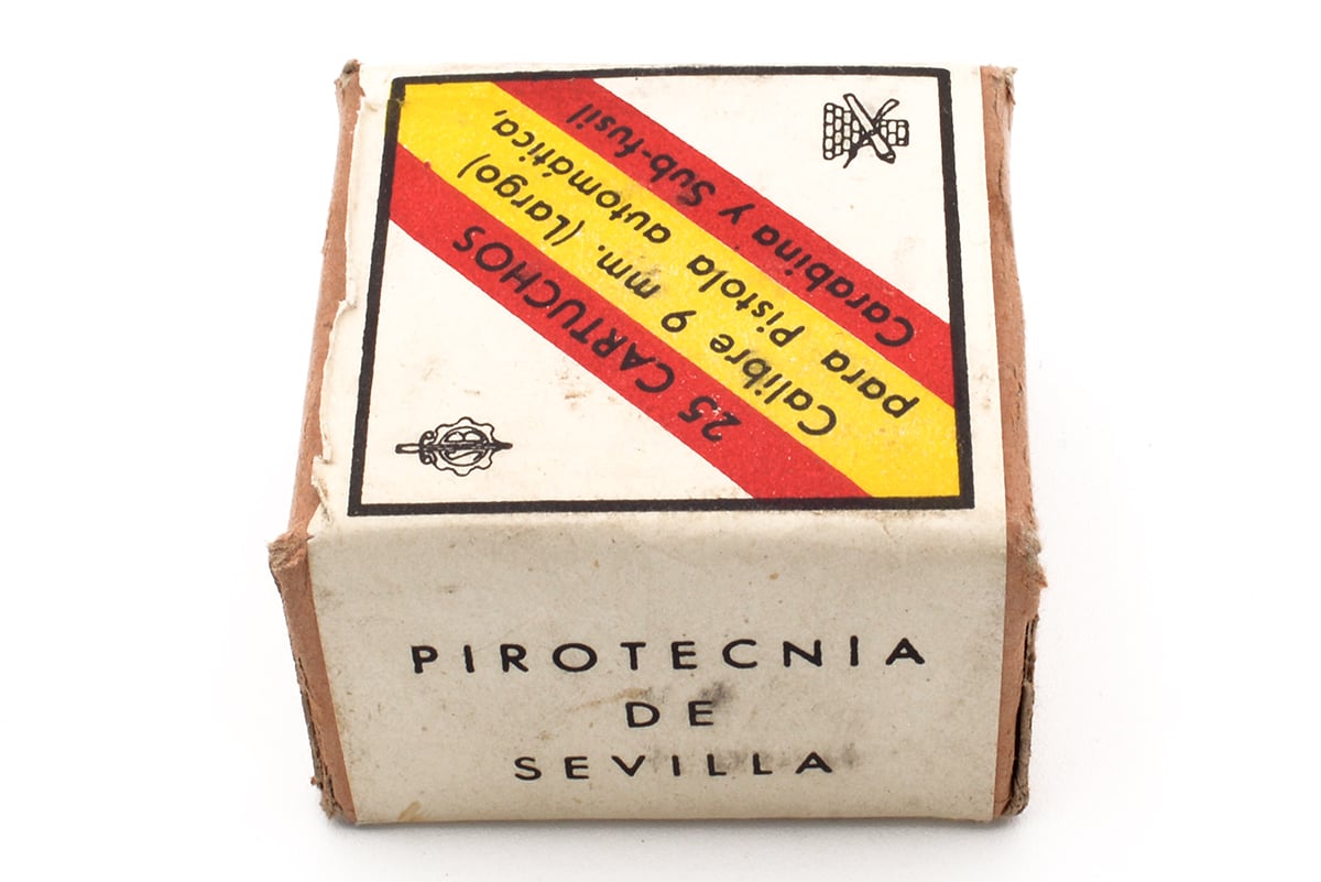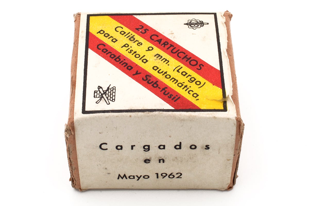 This is a box of Spanish surplus 9mm Largo (9x23mm) ammo. It features 127 grain FMJ bullets, brass metallic cartridges and Spanish military proof marks on the box. Overall this ammo is in good surplus condition with minimal signs of corrosion. This would be a good choice for surplus or military collectors.