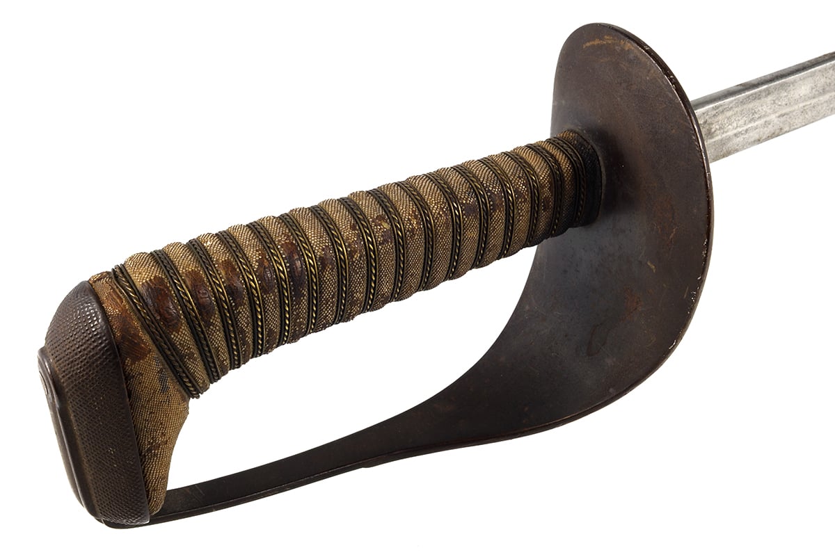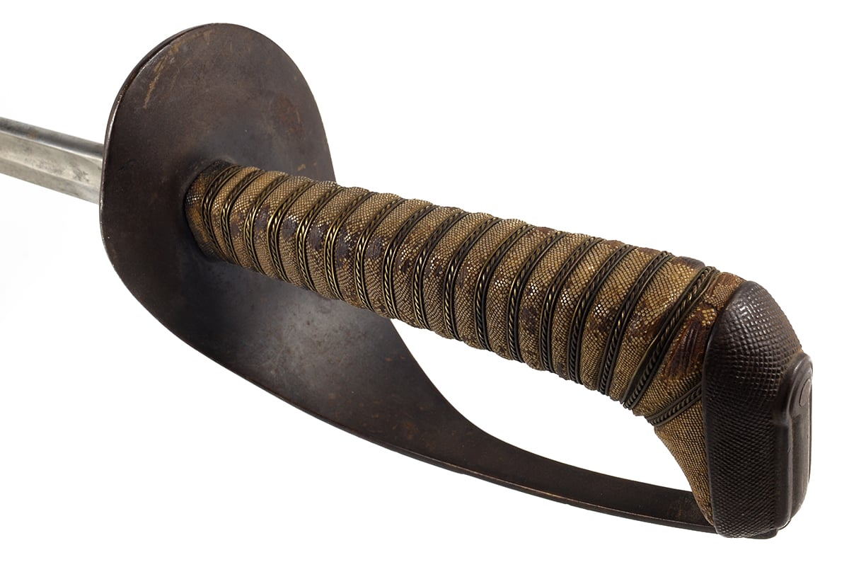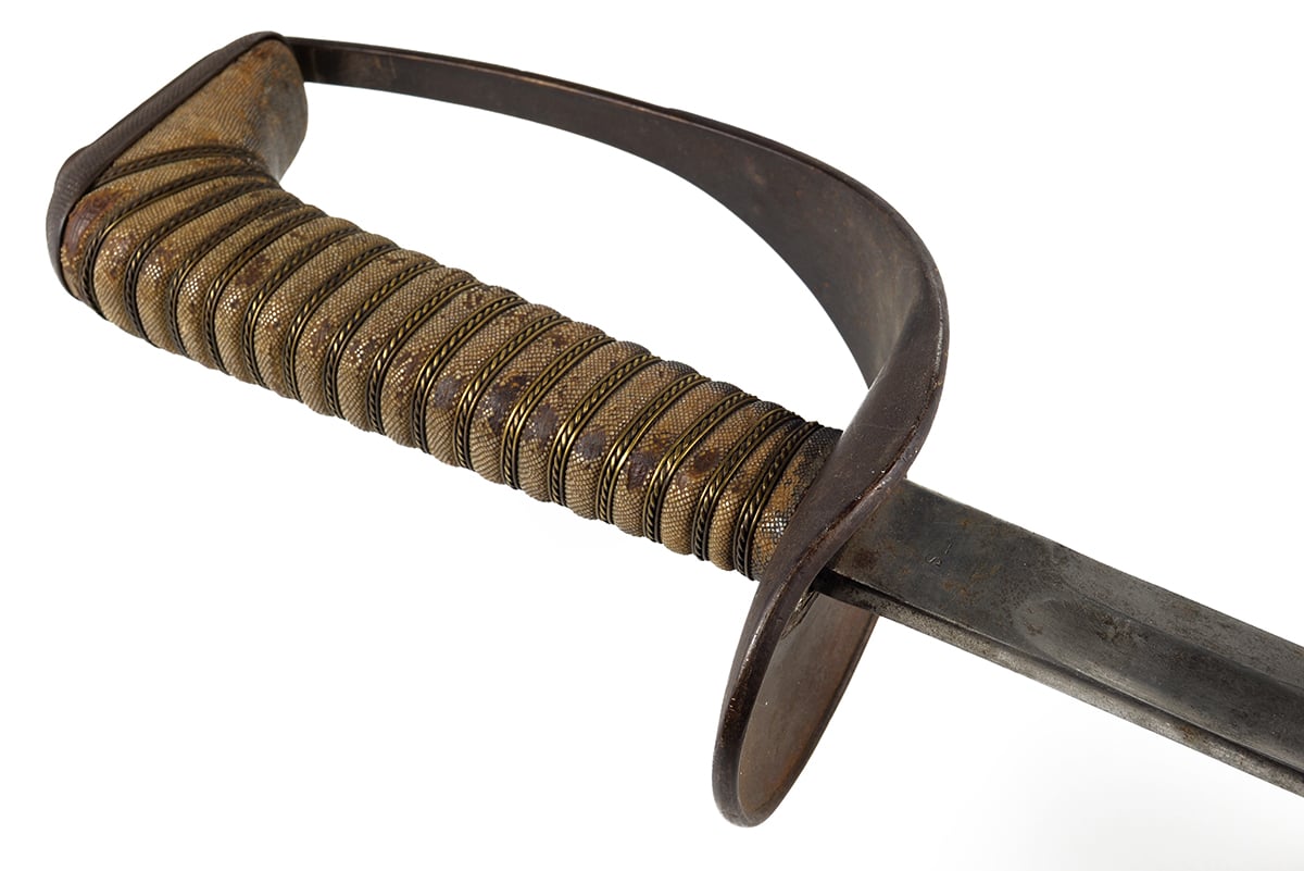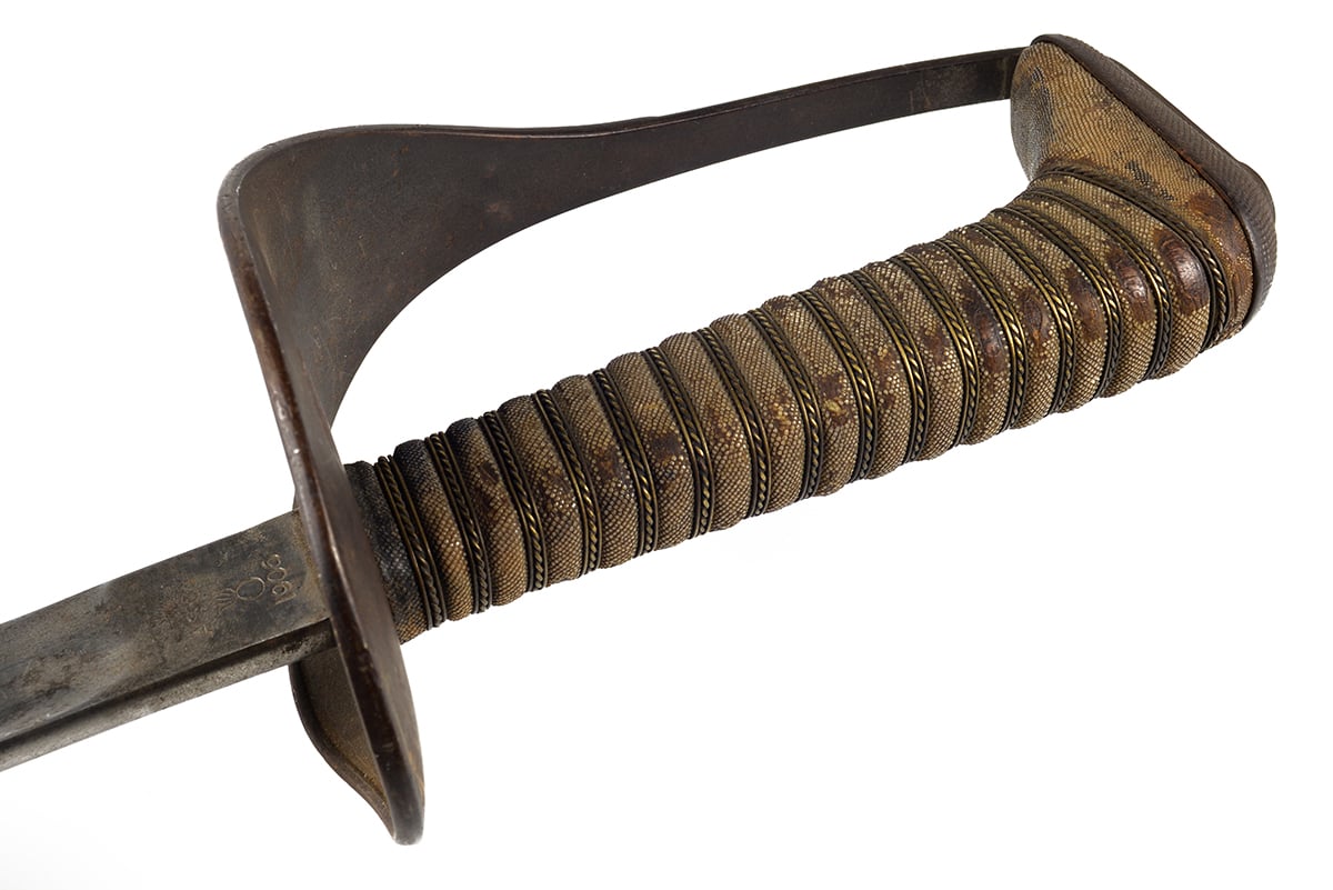 This example is in good condition with the original edge, there is some corrosion and tarnishing to the blade, patina on the guard and wear to the shark skin grip, the wire wrapping is in very nice shape. There is no scabbard included with this sword. Buy online today!