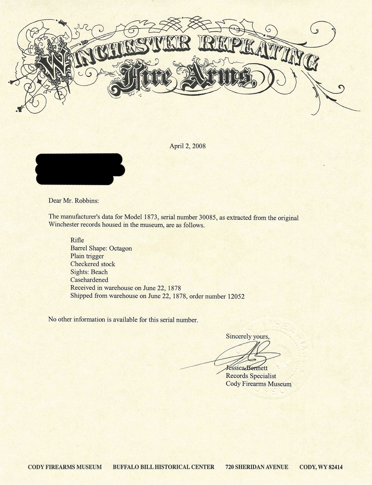 This exceptional Winchester Deluxe Model 1873 rifle was manufactured in 1878. The accompanying factory letter lists this rifle with an octagon barrel, plain trigger, checkered stock, and case-hardened finish when received in the warehouse on June 22, 1878; and It was shipped the same day. It is the very desirable 2nd Model 1873 rifle variation with checkered oval finger grip dust cover and screw-fastened dust cover guide. The rifle has a 24-inch octagon barrel with full-length magazine. The barrel has a sporting style front sight blade and buckhorn rear sight with knurled edges. The magazine has the first model style threaded cap. The upper receiver tang is factory drilled and tapped. The crescent butt-plate has a sliding brass butt-trap door. The barrel and magazine have a blued finish. The rear sight and bolt are both bright blue and the loading gate sports a bright niter blue finish. The forend cap, receiver, dust cover, hammer, trigger, lever, lever lock and crescent butt-plate are casehardened. The walnut stock and forend are of deluxe quality, featuring highly figured wood grain with a high polished finish. The stock and forend are factory checkered and extends nearly to the edge of the receiver on the forend and extends around the lower tang on the stock. The top of the barrel is roll stamped: “WINCHESTER’S-REPEATING-ARMS. NEW HAVEN.CT./KING’S-IMPROVEMENT- PATENTED-MARCH 29. 1866. OCTOBER 16. 1860.” in two lines ahead of the rear sight. The upper receiver tang is roll-stamped: “MODEL. 1873.” The serial number is stamped in script numerals on the lower tang between the lever latch and rear tang screw. The barrel and cartridge elevator, correctly feature a lack of the caliber markings found on later production Model 1873 rifles.