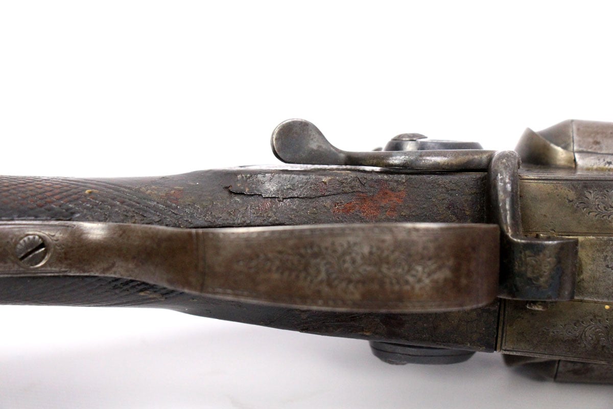 This is an antique English WW Greener shotgun chambered for 10 gauge black powder loads. It features 31-inch barrels, 2.5-inch chambers, external hammers, side-locking lever, and engraved lock plate. Overall, this shotgun is in good condition with normal age-related finish wear throughout the barrels, receiver, and stock. Both bores are in fair condition with significant pitting, the left barrel has a bulge approximately 4-inches from the muzzle. The stock has a crack under the lock plate on the right side and a crack near the trigger guard on the left side. Based on serial range, this shotgun was manufactured in 1873. This would be a good choice for antique gun collectors. Buy online today!