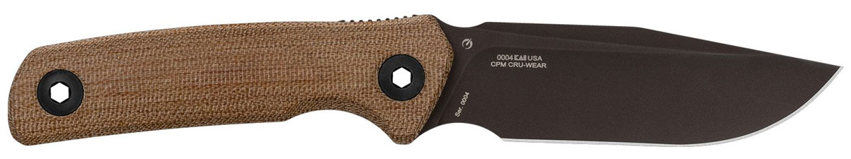The 0004 workhorse slices and chops through the toughest outdoor and bushcraft challenges. Its clip point blade uses premium Cru-Wear, a tough and easy-to-sharpen steel in the field. Easily control the canvas micarta handle, which is 3D-machined and contoured for your hand. Use an Allen wrench to strip the knife down for easy cleaning and reveal the skeletonized steel tang, ready for paracord wrapping. Carry the 0004 in multiple configurations using a Kansas-made, saddle tan leather sheath, storing the ultimate tool for your journey.